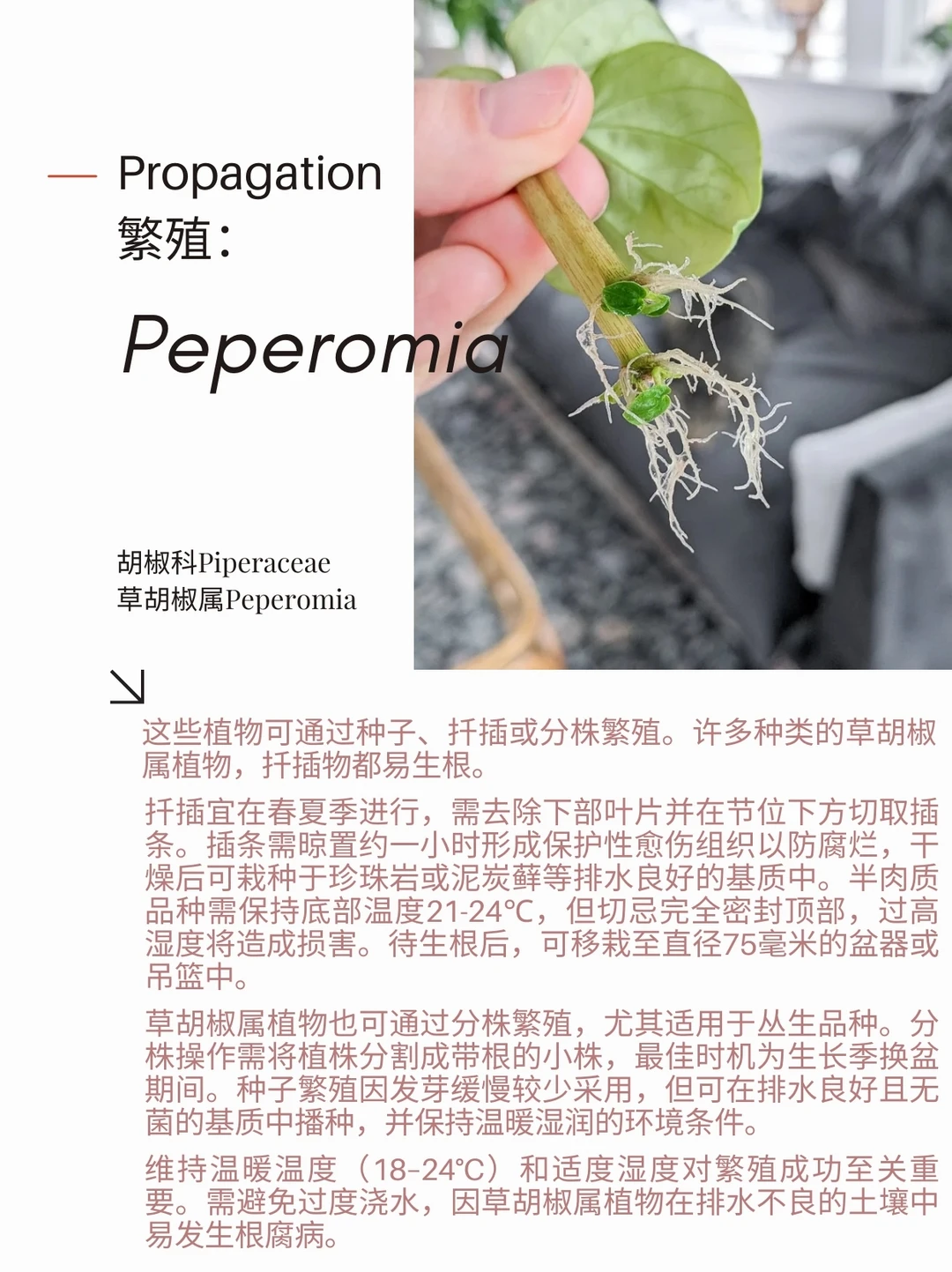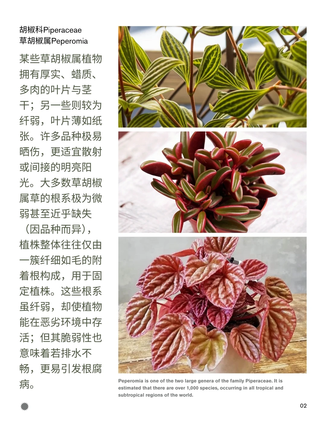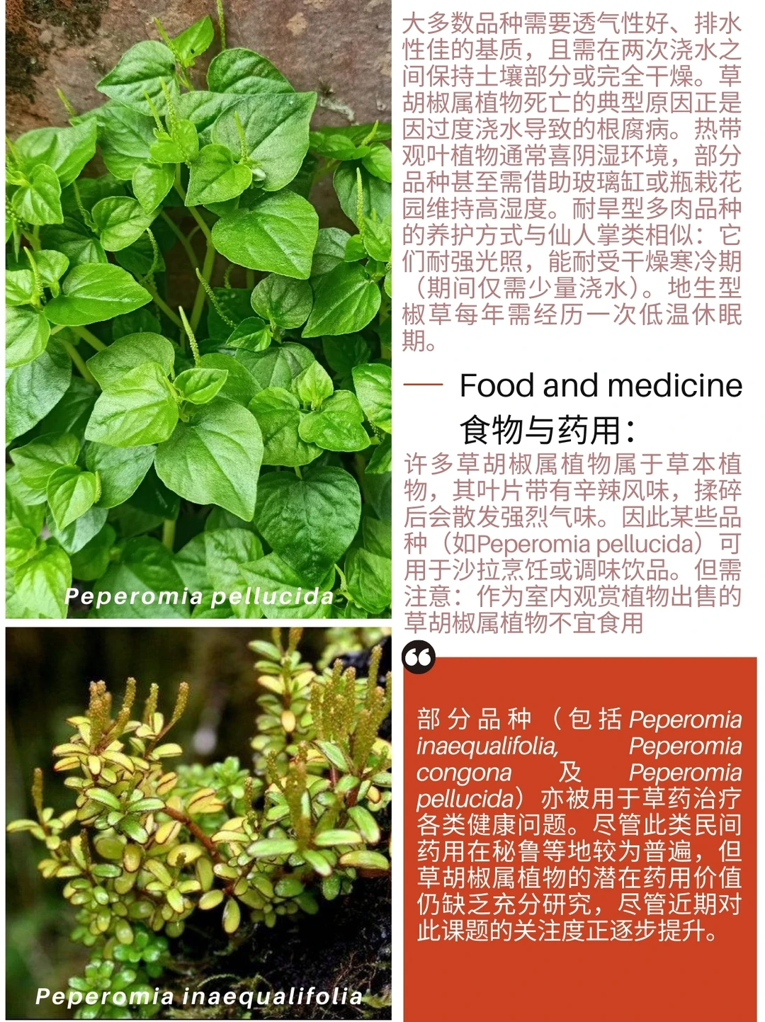 某些草胡椒属植物拥有厚实、蜡质、多肉的叶片与茎干;另一些则较为纤弱,叶片薄如纸张。许多品种极易晒伤,更适宜散射或间接的明亮阳光。大多数草胡椒属草的根系极为微弱甚至近乎缺失(因品种而异),植株整体往往仅由一簇纤细如毛的附着根构成,用于固定植株。这些根系虽纤弱,却使植物能在恶劣环境中存活;但其脆弱性也意味着若排水不畅,更易引发根腐病。