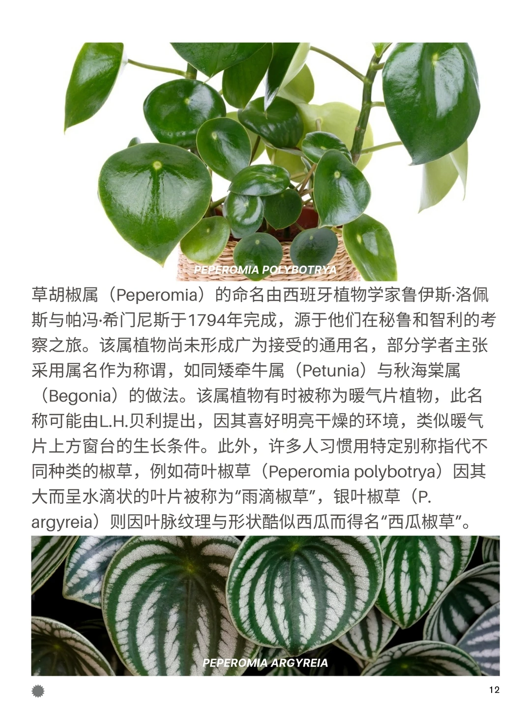 草胡椒属(Peperomia)的命名由西班牙植物学家鲁伊斯·洛佩斯与帕冯·希门尼斯于1794年完成,源于他们在秘鲁和智利的考察之旅。该属植物尚未形成广为接受的通用名,部分学者主张采用属名作为称谓,如同矮牵牛属(Petunia)与秋海棠属(Begonia)的做法。该属植物有时被称为暖气片植物,此名称可能由L.H.贝利提出,因其喜好明亮干燥的环境,类似暖气片上方窗台的生长条件。此外,许多人习惯用特定别称指代不同种类的椒草,例如荷叶椒草(Peperomia polybotrya)因其大而呈水滴状的叶片被称为“雨滴椒草”,银叶椒草(P. argyreia)则因叶脉纹理与形状酷似西瓜而得名“西瓜椒草”。