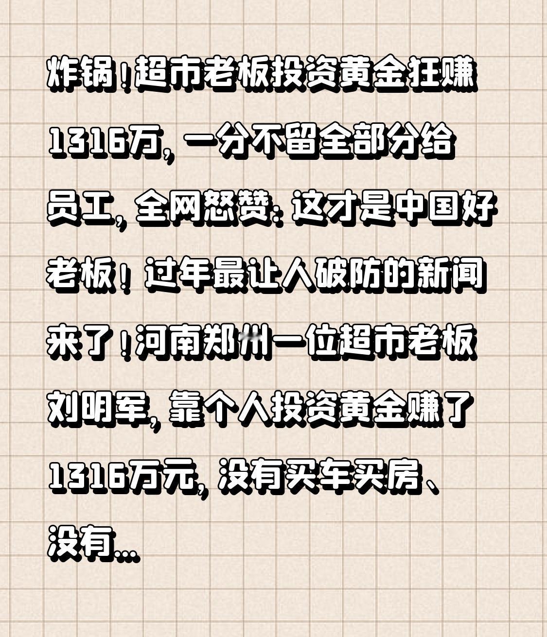 炸锅!超市老板投资黄金狂赚1316万,一分不留全部分给员工,全网怒赞:这才是中国好老板! 过年最让人破防的新闻来了!河南郑州一位超市老板刘明军,靠个人投资黄金赚了1316万元,没有买车买房、没有存进自己账户,而是一分不剩,全部分给了河南、山西两地2533名员工!消息一出,全网沸腾,网友直呼:这样的老板,请给我来一打! 很多人第一反应不敢信:赚了上千万,居然全部分完?老板图啥?刘明军的回答太圈粉:这是我个人投资收益,不是公司公款,就是想让跟着自己打拼的兄弟姐妹们,过个踏实富足的新年。而且这不是第一次,早在2025年4月,他就把近千万黄金收益全部分给员工,说到做到,绝不画饼! 分配规则更是暖心到骨子里:入职满2年直接领10000元,满1年领2000元,新员工也有1000元。不分岗位、不看职级,保洁阿姨、后厨厨师、收银员、理货员,人人有份、公平公开。员工们排队领现金红包,手里攥着真金白银,脸上笑开了花,有人当场红了眼:跟着这样的老板,再苦再累都值得! 本以为老板会留一部分给自己,没想到他直接平仓落袋,全部回馈员工。刘明军说,创业之初就承诺:有钱一起赚、有福一起享,未来还要把分红常态化,争取以后分一个亿!不搞压榨、不玩套路,把员工当家人,把承诺当责任,这才是最难得的格局。 在这个很多企业抠成本、减福利、画大饼的时代,刘明军用最直接的方式,诠释了什么叫良心老板。员工不是工具,是并肩作战的伙伴;财富不是独享,是共同奋斗的回报。一句“有钱大家分”,胜过千万句鸡汤。 这波操作不仅暖了员工,更治愈了无数打工人。我们努力工作,不只是为了薪水,更是为了被尊重、被看见、被真心对待。好老板可遇不可求,懂得分享、心怀善意,才能走得更远。 新的一年,愿所有打工人都能遇到靠谱的老板,愿所有付出都有回报,愿善良与格局,永远被温柔以待。你遇到过这么暖心的老板吗?评论区聊聊,为中国好老板点赞!
