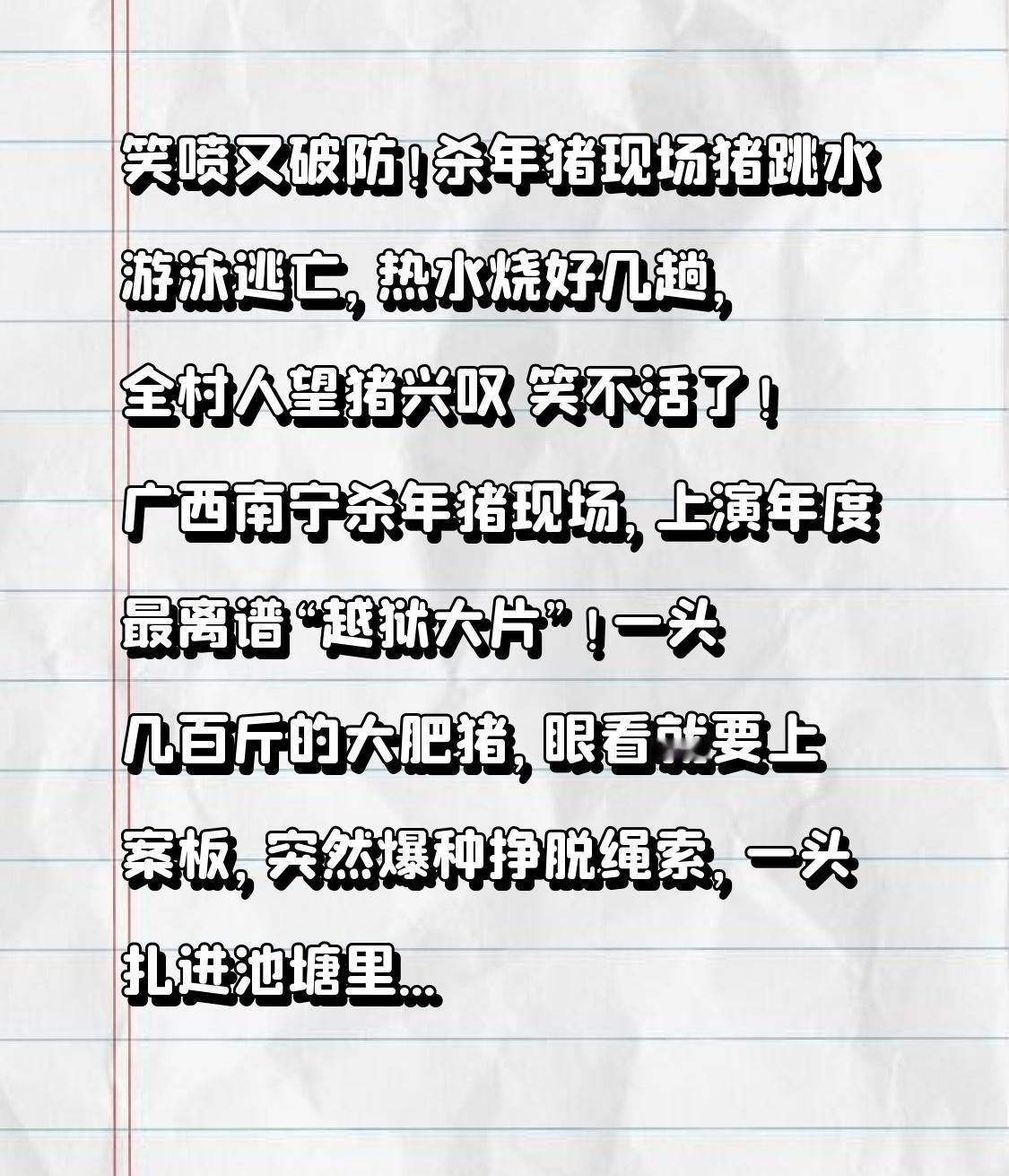 笑喷又破防!杀年猪现场猪跳水游泳逃亡,热水烧好几趟,全村人望猪兴叹 笑不活了!广西南宁杀年猪现场,上演年度最离谱“越狱大片”!一头几百斤的大肥猪,眼看就要上案板,突然爆种挣脱绳索,一头扎进池塘里开启自由泳模式,全村壮汉围堵半天抓不着,热水烧了好几趟,猪还在水里悠哉游,网友笑称:这是二师兄归位,掌管水军来了! 本来是农村最热闹的杀年猪场面,大锅架好、热水烧足,几个壮汉摩拳擦掌,就等把年猪处理好,备上过年的腊肉香肠。谁料这头猪脾气太倔,被按住的瞬间拼命挣扎,猛地一挣就冲破包围,撒腿冲向村口池塘,“噗通”一声跳下去,动作干脆利落,半点不拖泥带水。 本以为它下水就慌了神,没想到人家是天生游泳健将!身体浮力足、鼻孔朝上,在水里蹬腿划水,游得又稳又快,一会儿潜下去一会儿浮上来,把岸边的人耍得团团转。村民拿棍子够、扔绳子套、下水想围堵,全被它灵活躲开,愣是在水里跟全村人“对峙”,场面又搞笑又无奈。 转折点来了!本来是抓年猪的热闹事,看着猪在冷水里拼命求生,原本笑着围观的村民,心里都软了下来。有人说“算了算了,让它多活几天”,有人干脆放弃抓捕,任由它在水里待着。原本准备好的杀猪工具全闲置,过年的流程被一头猪彻底打乱,却多了份意想不到的温情。 这一幕传到网上,直接炸锅!网友们笑疯了:“猪都知道冷水比热水舒服”“求生欲拉满,这年猪杀不成了”“建议直接放生,过年吃素积福”。笑过之后又让人破防,万物皆有灵,哪怕是一头猪,也在拼尽全力活下去,这份顽强的生命力,真的太戳人。 杀年猪是过年的老传统,藏着烟火气与团圆味;而这头猪的逃亡,更让我们看见生命的倔强。不刻意伤害、多一份心软,既是对生命的尊重,也是过年最朴素的善意。 你见过这么聪明的年猪吗?有没有遇到过农村杀年猪的搞笑趣事?评论区聊一聊,沾沾这头“越狱猪”的生命力,愿新的一年,我们都能顽强向上、平安顺遂!