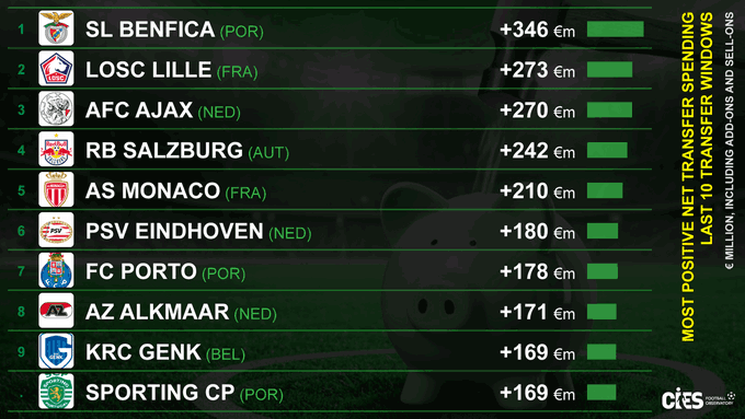 虎扑02月12日讯根据国际足球研究中心(CIES)的数据,本菲卡、里尔和阿贾克斯在过去5年,10个转会窗的净收入中位列前三,分别以3.46亿欧元、2.73亿欧元和2.70亿欧元的支出,领跑欧洲足球俱乐部。