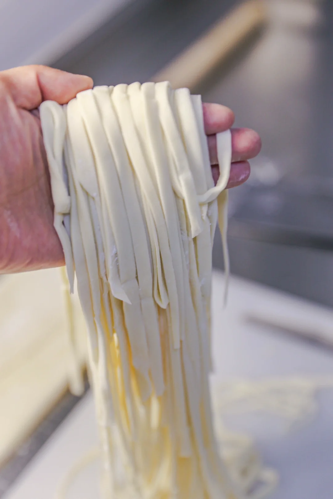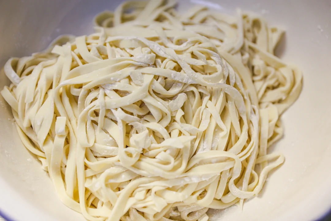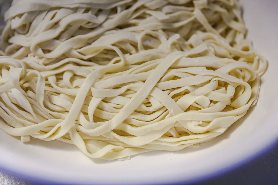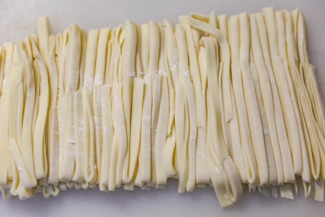 2️⃣:醒好的面团用擀面杖擀成厚度大约0.3公分的片状,折叠起来,用刀切成宽约1厘米足有的面条,醒发过的面条非常有筋性,你也可以用手从面条两端拉长,拉成自己喜欢的面条长度即可。