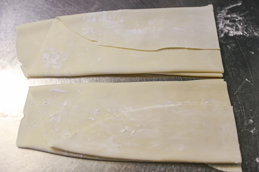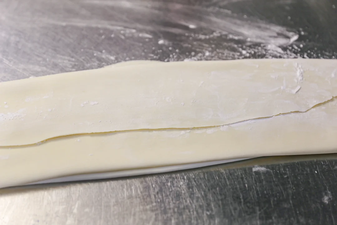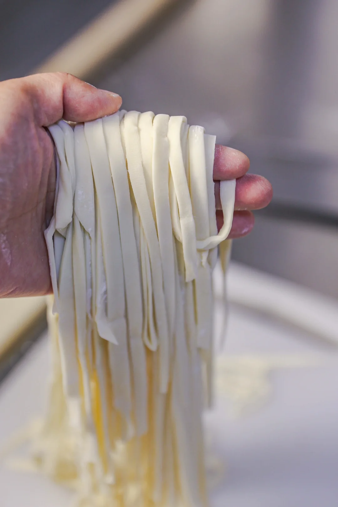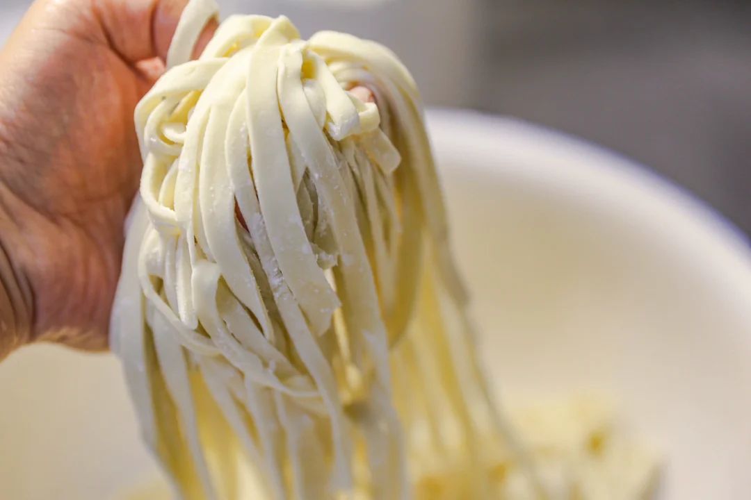 2️⃣:醒好的面团用擀面杖擀成厚度大约0.3公分的片状,折叠起来,用刀切成宽约1厘米足有的面条,醒发过的面条非常有筋性,你也可以用手从面条两端拉长,拉成自己喜欢的面条长度即可。