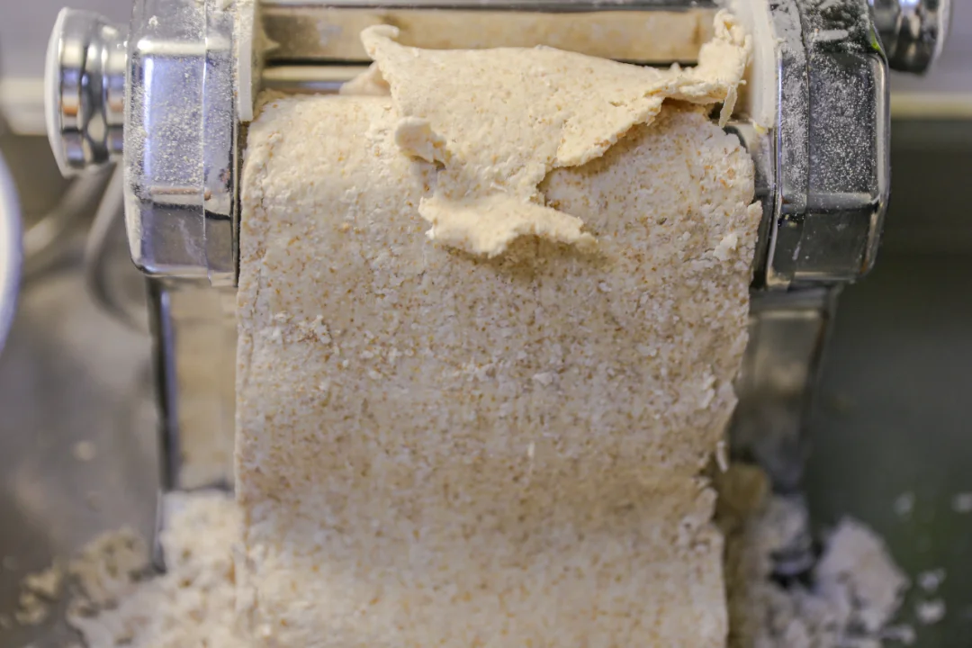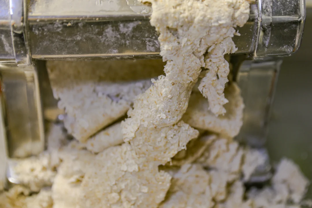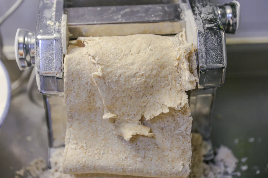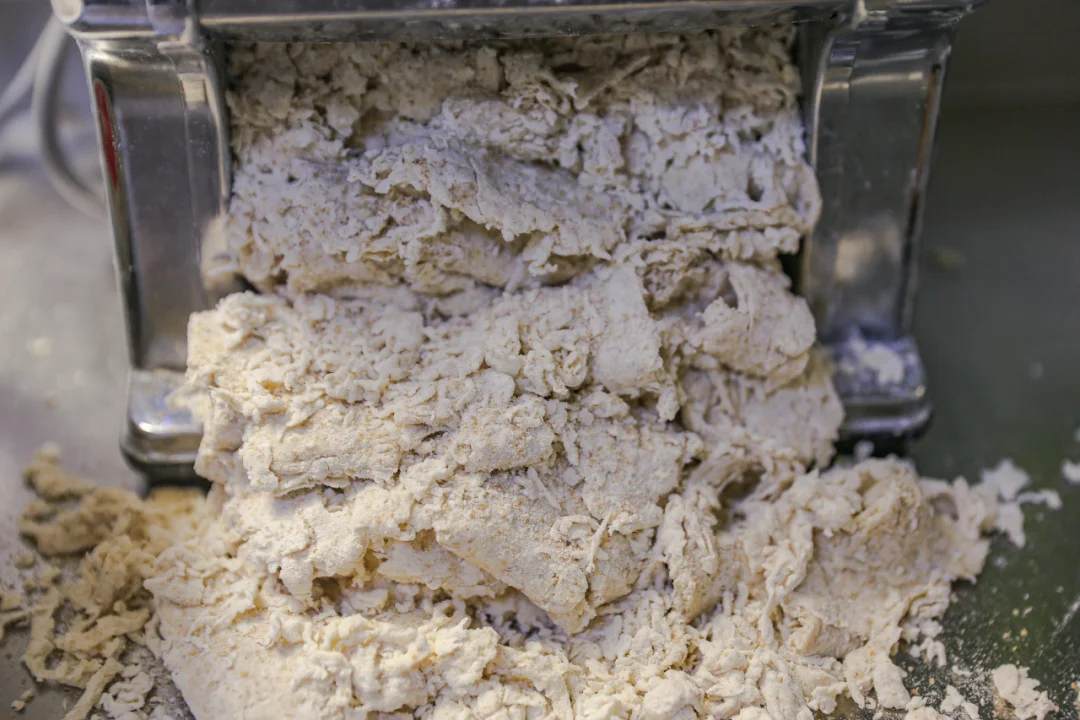 4.第二遍压制的时候把不规则面片继续放进去,来回反复加面絮,慢慢就会成长长的不光滑的面片。