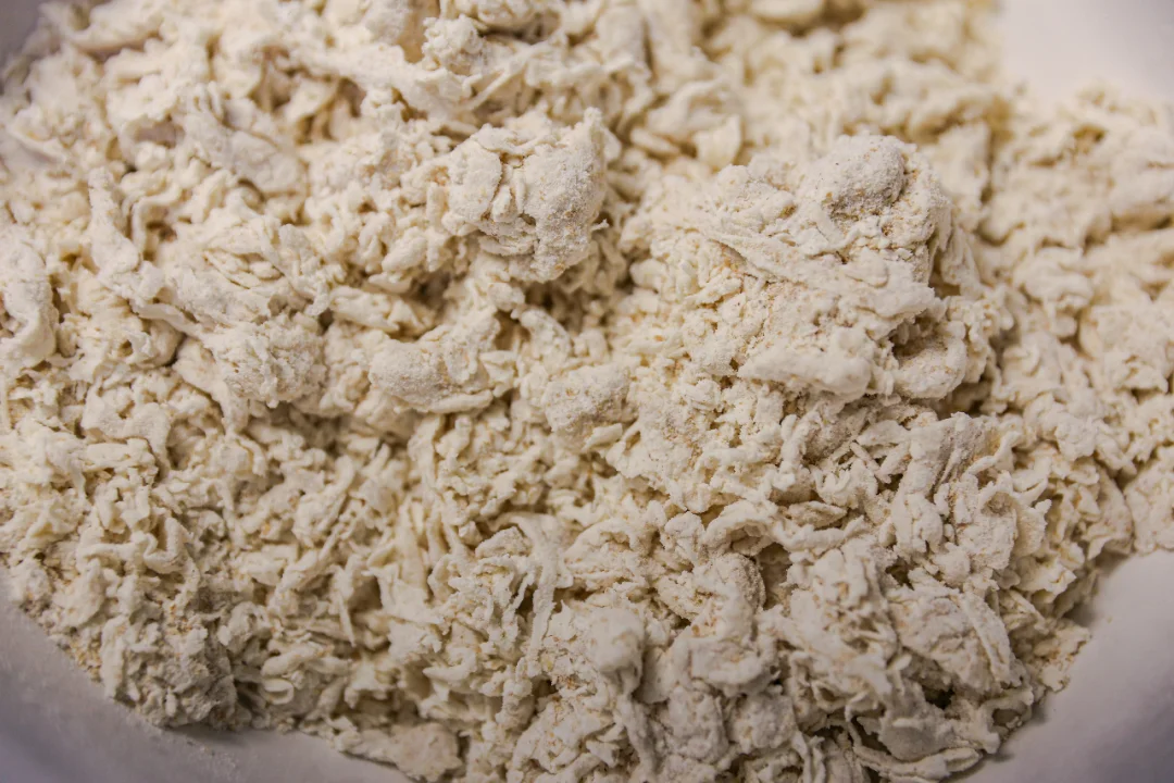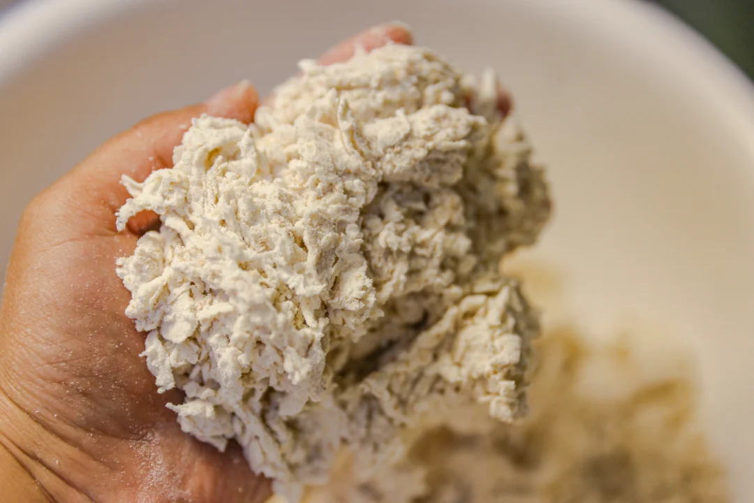 2.清水少量多次加入,慢慢搅拌成絮状,无需揉成面团。