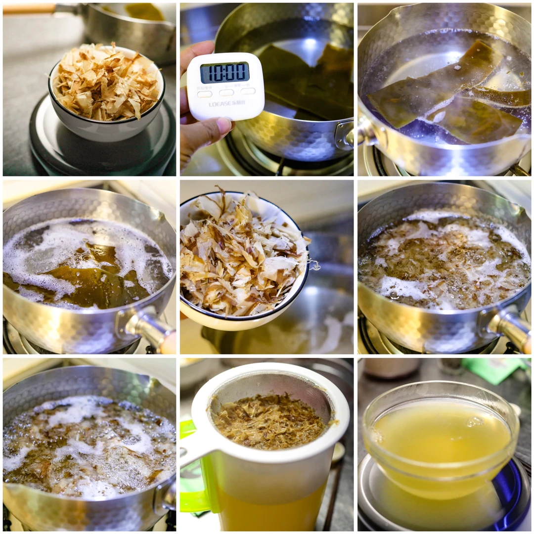 1.木鱼花20克,提前浸泡过的昆布小火加热,一定不要刚开始就大火。如果那样的话,昆布很快就会分泌粘液,比较容易影响口感。