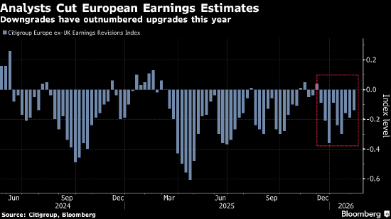 欧洲基准股指正逐步回升至纪录高位,投资者权衡迄今为止喜忧参半的财报季表现。花旗集团指数显示,自2025年底以来,下调盈利预期的分析师数量已超过上调者。