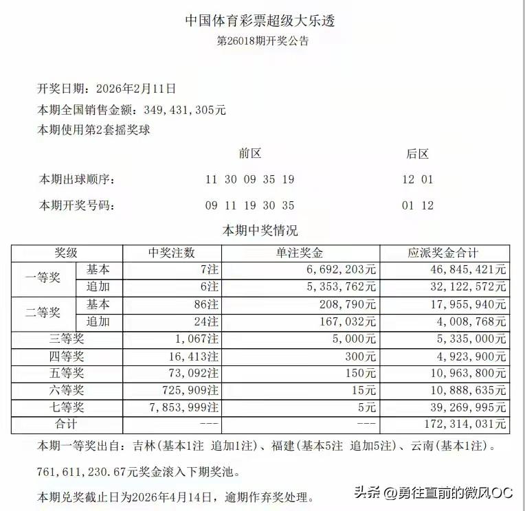天南地北大拜年2月11日晚,体彩大乐透第26018期收官开奖,头奖井喷并刷新新规后最高中奖纪录。当期开出7注一等奖,单注基本奖金669万元,6注追加后单注达1204万元。福建独揽5注追加头奖,若一人独揽总奖金超6022万元;吉林、云南各中1注。二等奖86注,基本20万元、追加后37万元。奖池滚存7.6亿元,保持稳定。