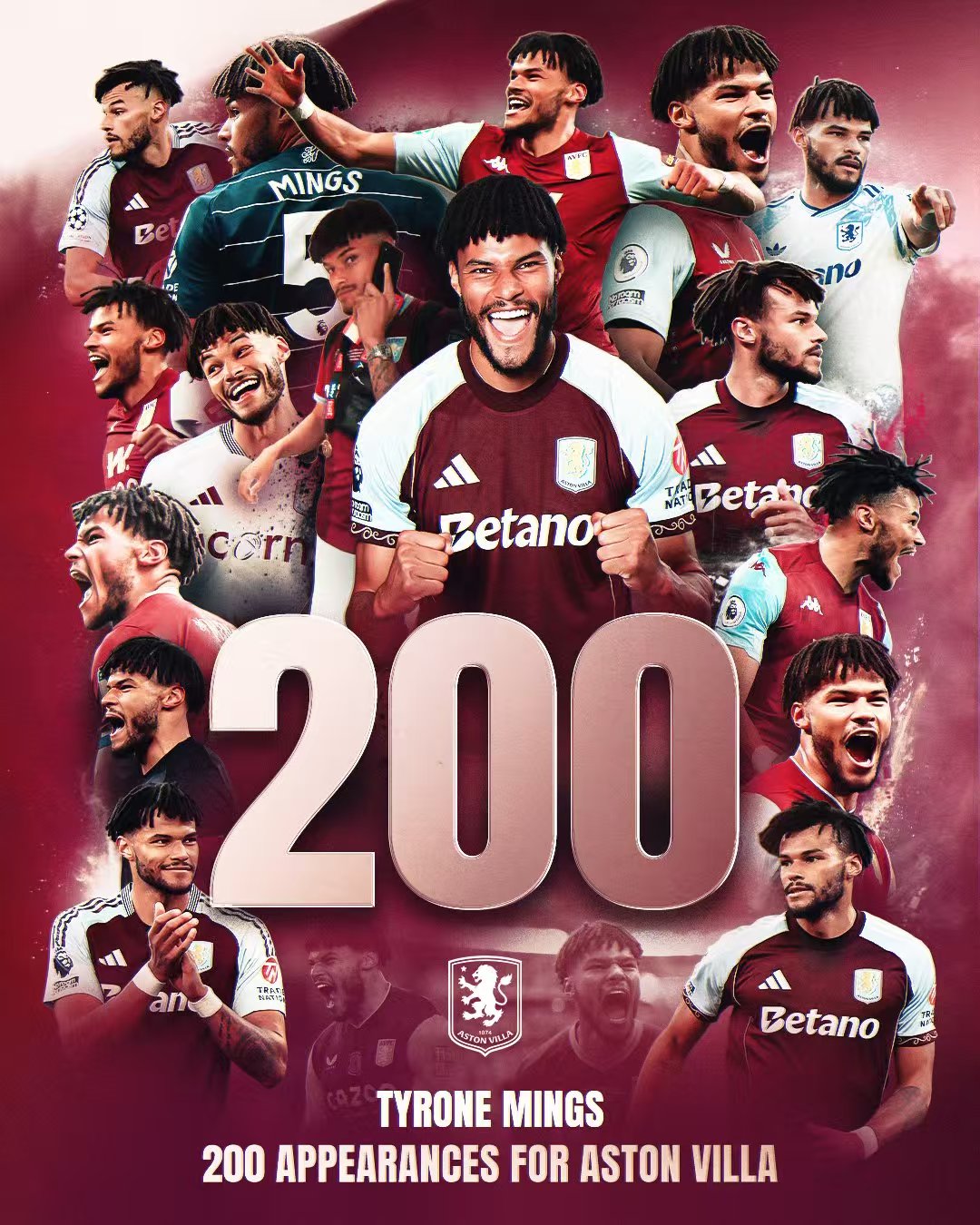 里程碑,明斯迎来代表阿斯顿维拉出场的第200场比赛