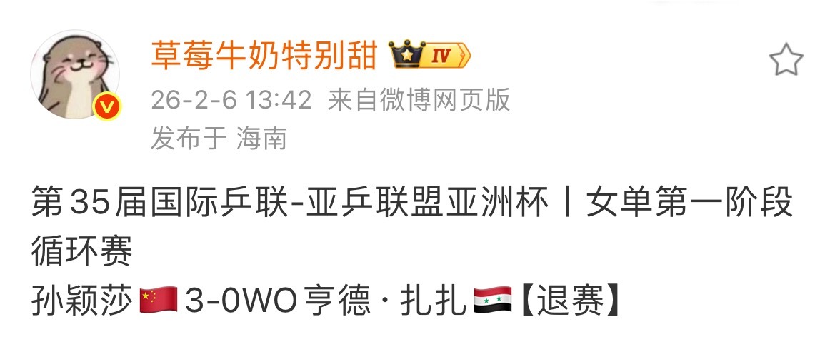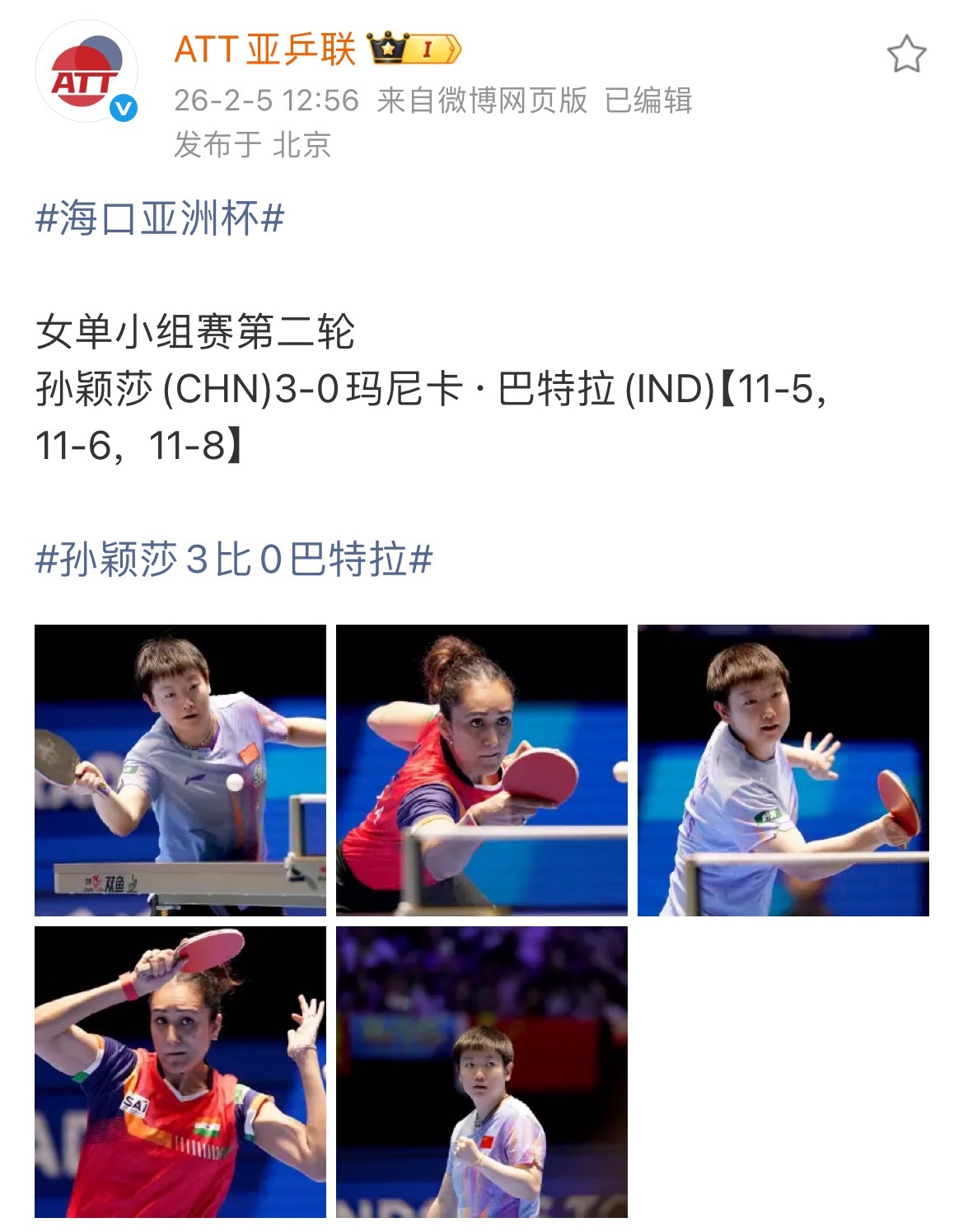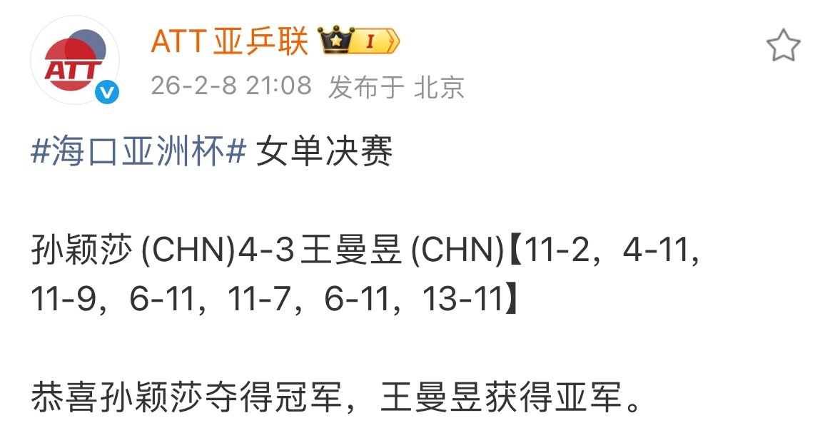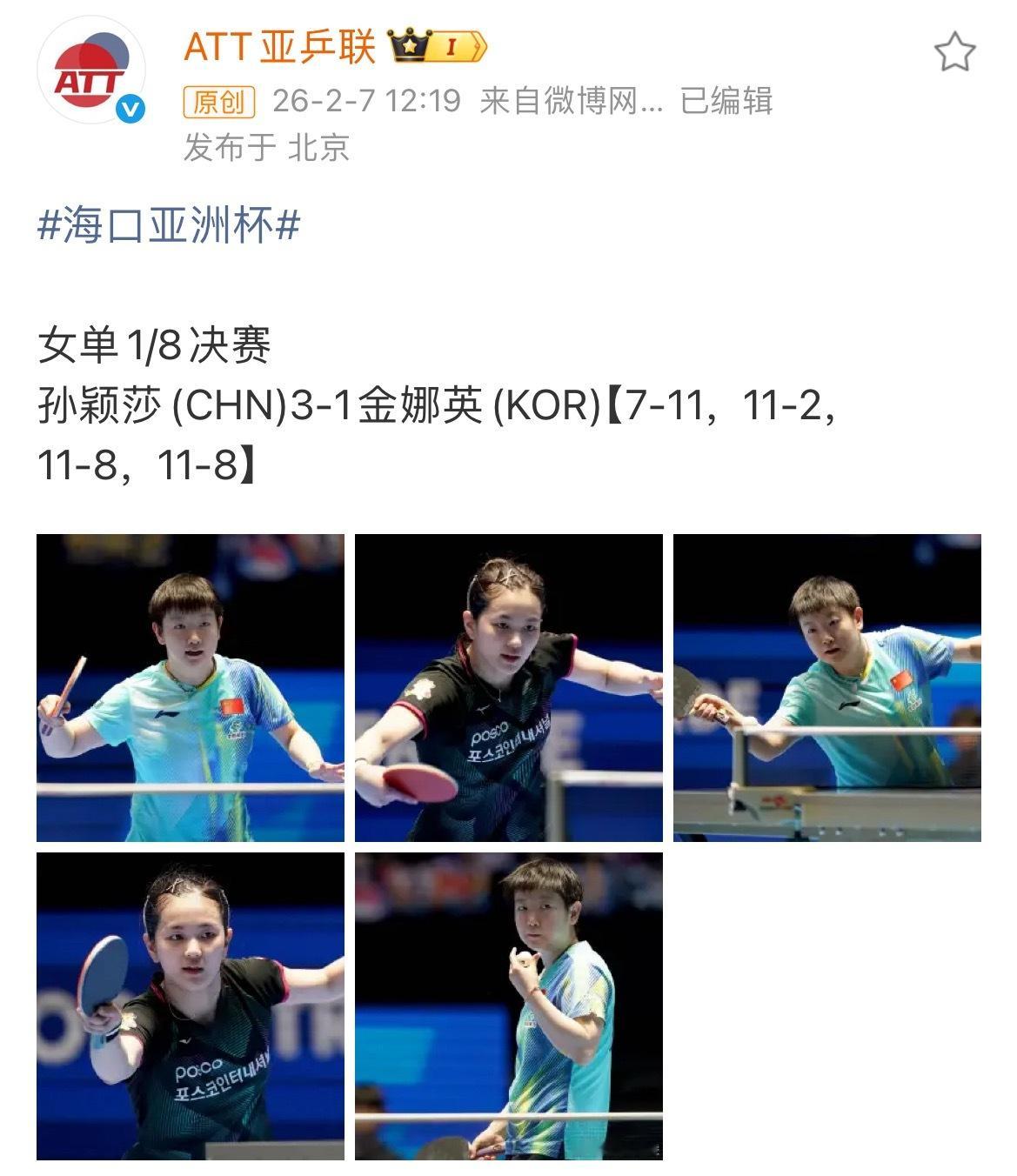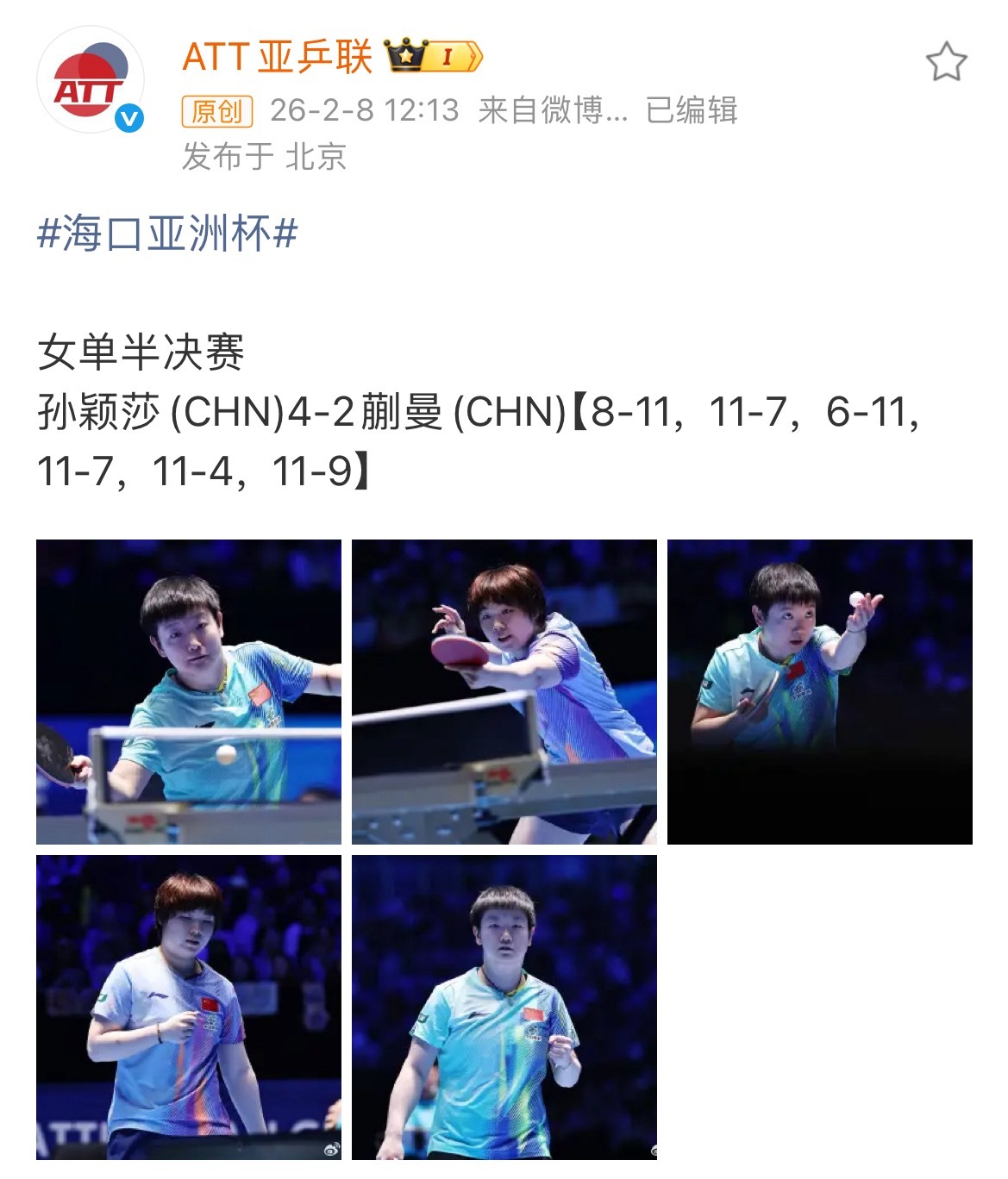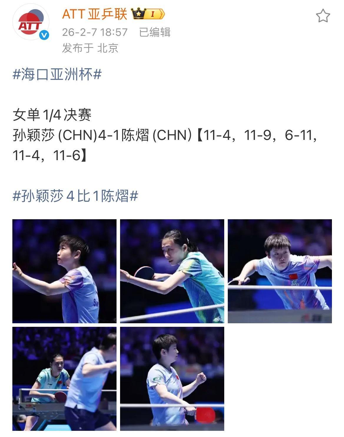 祝贺孙颖莎战胜队友王曼昱夺得亚洲杯女单冠军![赞][赞][赞]