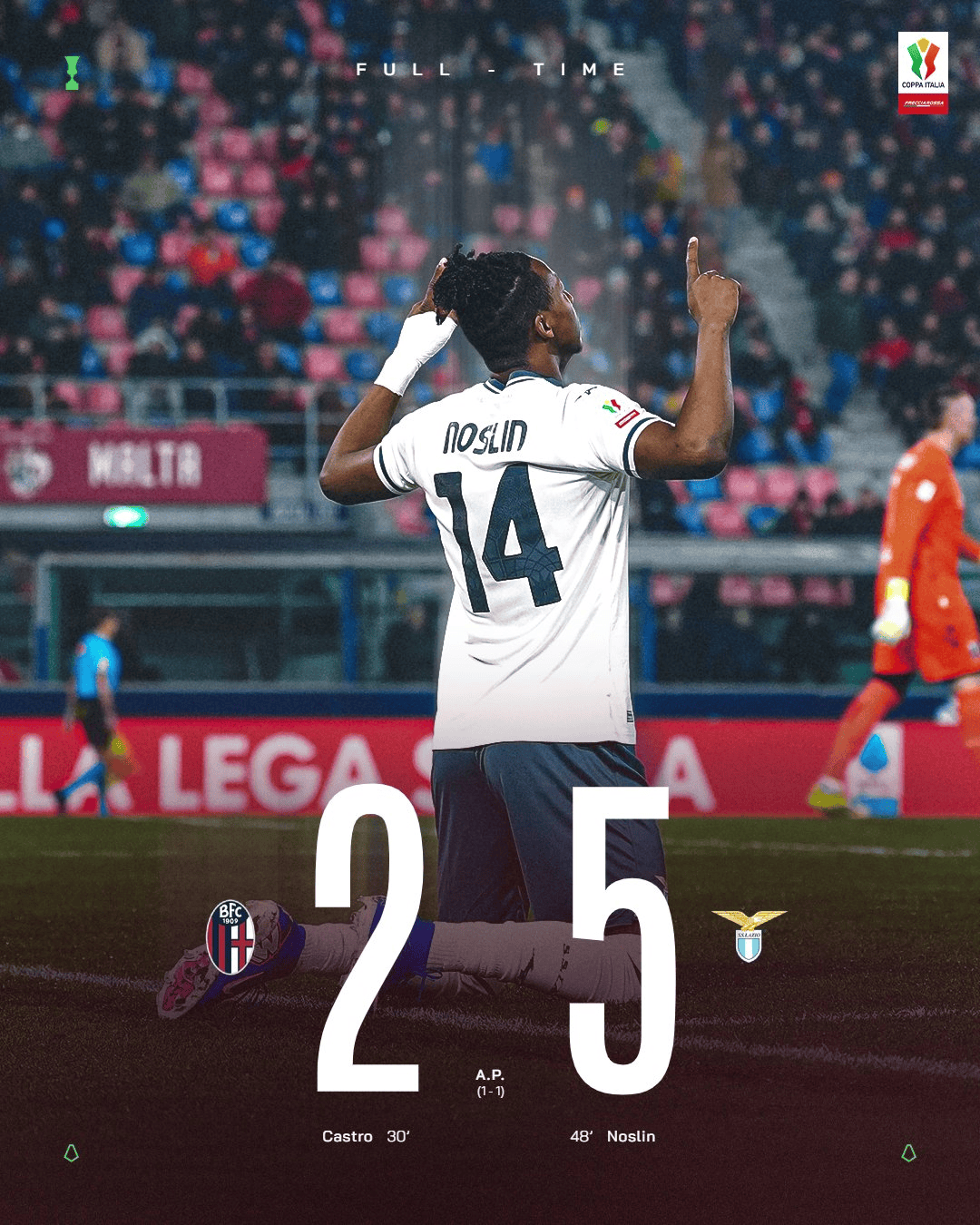 圣地亚哥-卡斯特罗在上半场为博洛尼亚首开记录,诺斯林在下半场帮助拉齐奥扳平比分。
