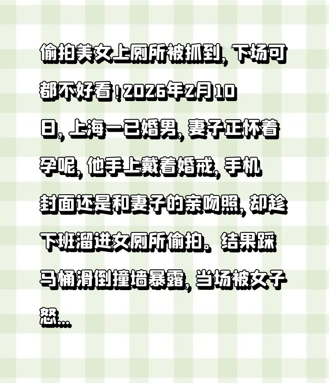 偷拍美女上厕所被抓到,下场可都不好看! 2026年2月10日,上海一已婚男,妻子正怀着孕呢,他手上戴着婚戒,手机封面还是和妻子的亲吻照,却趁下班溜进女厕所偷拍。结果踩马桶滑倒撞墙暴露,当场被女子怒怼。女子果断报警,该男子被行政拘留10天,这就是法律的制裁。 还有江西农业大学南昌商学院的学生余某某,5月20日偷拍女厕被当场抓获。学校也没姑息,次日就决定开除其学籍。 这些偷拍者触碰道德和法律底线,都付出了惨痛代价。所以啊,别心存侥幸,违法乱纪的事干不得!