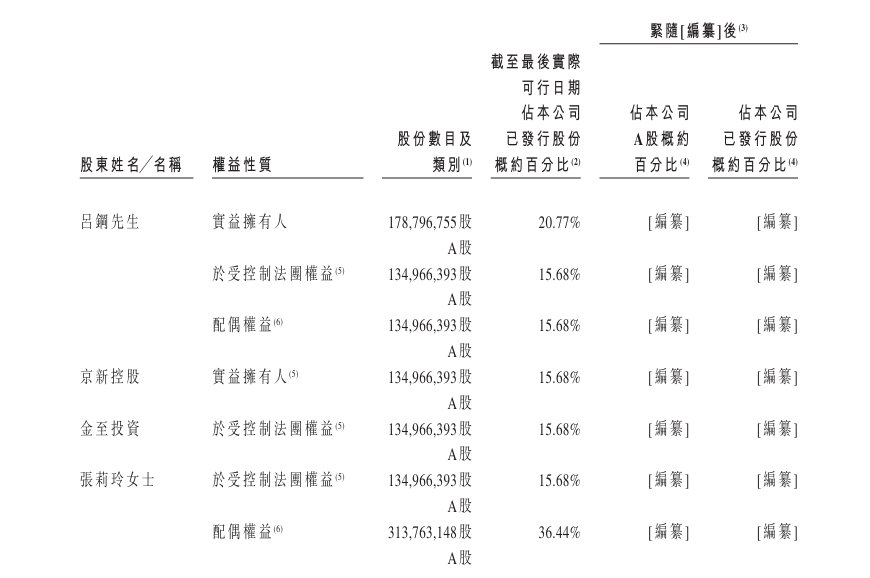 具体而言,公司分别由吕钢先生及京新控股直接持有约20.77%及15.68%权益。京新控股分别由吕钢先生及金至投资拥有51.00%及49.00%权益。金至投资分别由吕钢先生及吕钢先生的配偶张莉玲女士拥有60.00%及40.00%权益。