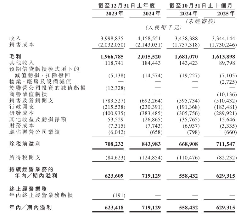 于2023年度、2024年度、2025年截至10月31日止十个月,公司录得年内/期内溢利分别约6.23亿元、7.19亿元、6.29亿元。