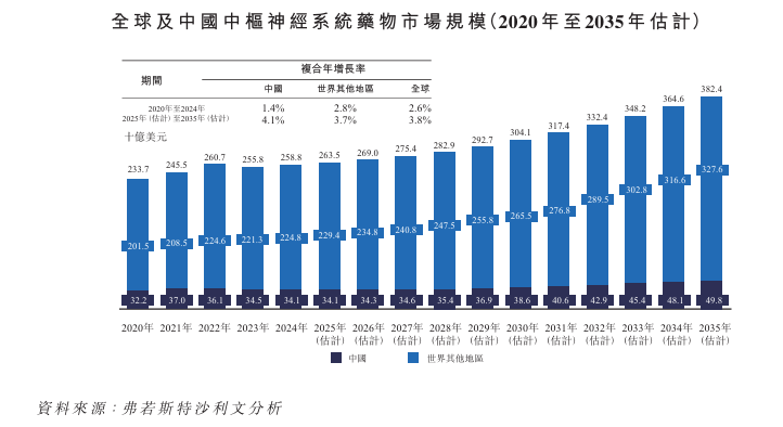 全球中枢神经系统药物市场规模庞大且正进入稳定增长期,其中中国已成为增长最快的区域之一。2020年至2024年间,全球中枢神经系统药物市场规模从2,337亿美元增加至2,588亿美元,该期间的复合年增长率达2.6%。