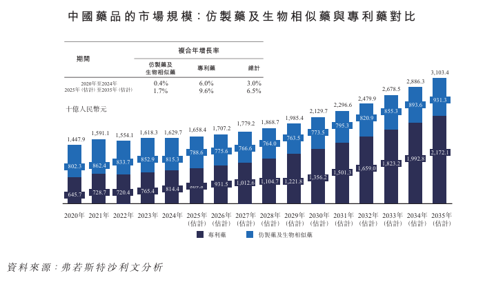 中国药品市场由2020年的人民币14,479亿元增加至2024年的人民币16,297亿元,2020年至2024年间的复合年增长率为3.0%,预计到2035年将进一步增长至人民币31,034亿元,2025年至2035年间的复合年增长率为6.5%,高于同期预计的全球复合年增长率5.1%。