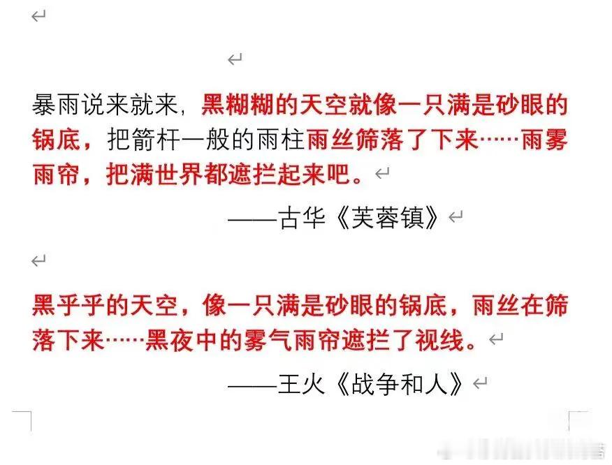 古华写暴雨前“黑糊糊的天空就像一只满是砂眼的锅底”,王火抄过来,把“糊糊”改成“乎乎”。