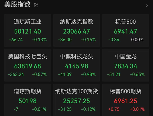 截至收盘,道琼斯指数跌0.13%,报50121.40点;标普500指数微跌0.34点,报6941.47点;纳斯达克指数跌0.16%,报23066.47点。
