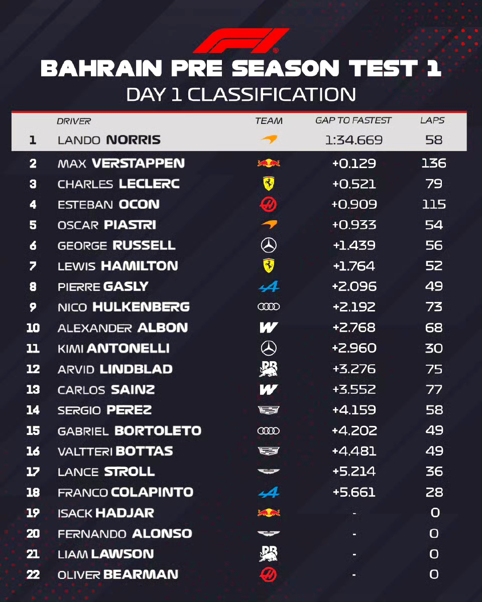 虎扑02月12日讯周三,2026年F1季前测试的前两场在巴林国际赛道拉开帷幕,兰多-诺里斯登上最快单圈表榜首,领先马克斯-维斯塔潘和夏尔-勒克莱尔。