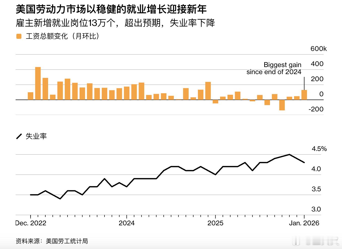 美国最新非农就业报告显示,美国劳动力市场在2026年初出现企稳迹象。根据美国劳工统计局公布的数据,1月份新增就业人数为13万,大幅高于市场预期的6.5万,是一年多来最强的单月表现;失业率也意外下降至4.3%。这一结果表明,经历了2025年几乎“停滞式”的招聘低谷后,就业市场正在逐步恢复稳定。