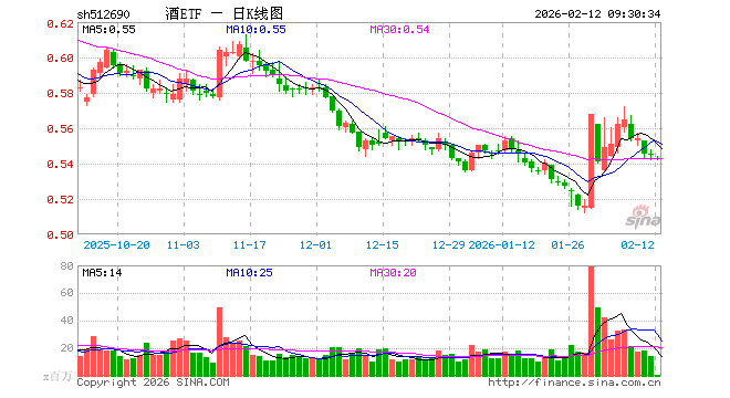 2月12日,酒ETF(512690)开盘跌0.37%,报0.543元。酒ETF(512690)重仓股方面,贵州茅台开盘跌0.27%,五粮液跌0.13%,泸州老窖跌0.33%,山西汾酒跌0.68%,洋河股份跌0.07%,今世缘跌0.36%,青岛啤酒涨0.00%,古井贡酒跌0.40%,燕京啤酒跌0.24%,舍得酒业跌0.02%。