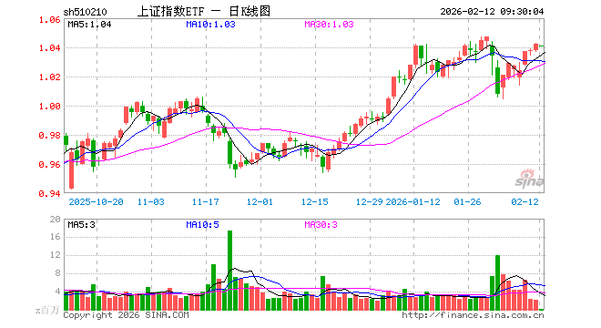 2月12日,上证指数ETF(510210)开盘跌0.10%,报1.041元。上证指数ETF(510210)重仓股方面,农业银行开盘涨0.00%,中国石油涨0.37%,贵州茅台跌0.27%,工业富联涨0.27%,中国银行涨0.00%,紫金矿业涨0.23%,中国神华跌0.02%,中国人寿涨0.02%,招商银行涨0.00%,中国平安涨0.15%。