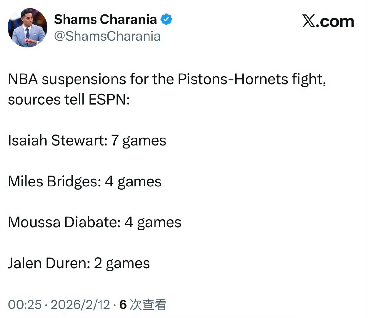 Shams:ESPN消息源透露,活塞与黄蜂冲突事件的禁赛处罚如下: