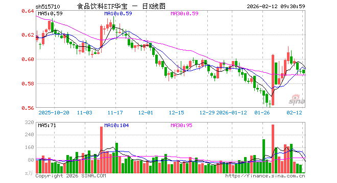 2月12日,食品饮料ETF华宝(515710)开盘涨0.17%,报0.591元。食品饮料ETF华宝(515710)重仓股方面,贵州茅台开盘跌0.27%,五粮液跌0.13%,伊利股份跌0.11%,泸州老窖跌0.33%,山西汾酒跌0.68%,海天味业涨0.22%,东鹏饮料涨0.31%,洋河股份跌0.07%,安琪酵母跌0.57%,今世缘跌0.36%。