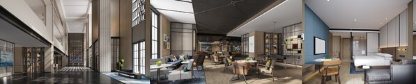 从左到右(效果图):青田福朋喜来登酒店大堂、肆面吧,客房