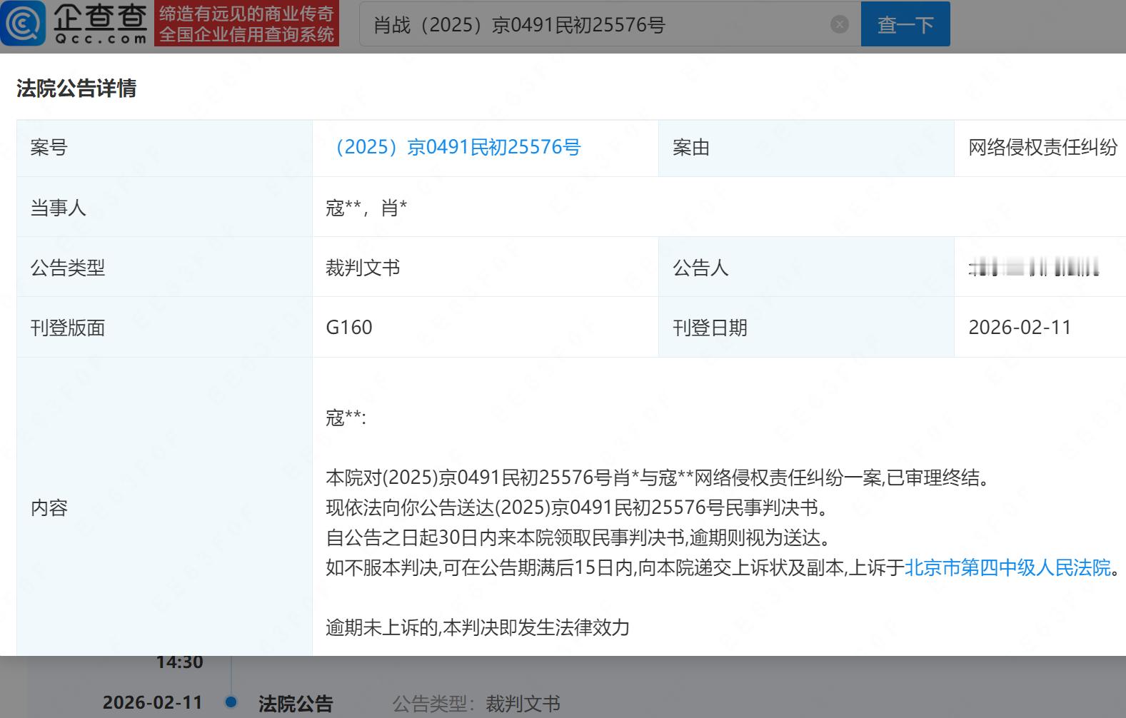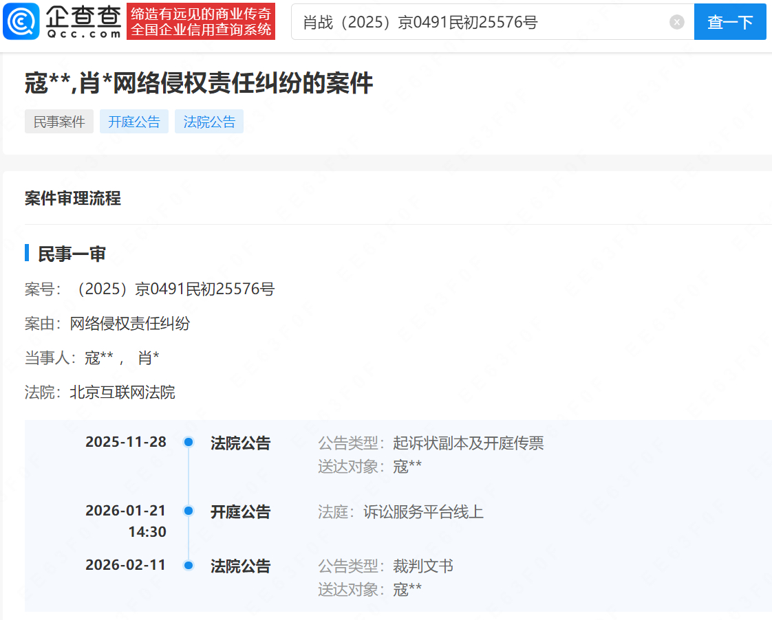 【肖战维权进展】法院向侵权肖战网民公告送达判决书据企查查,近日,诉寇某某网络侵权责任纠纷案已审理终结,法院向被告公告送达民事判决书。如不服本判决,可在公告期满后15日内,向法院递交上诉状及副本,逾期未上诉的,判决即发生法律效力。案件流程信息显示,去年11月肖战起诉寇某某,该案于今年1月21日在北京互联网法院开庭审理。