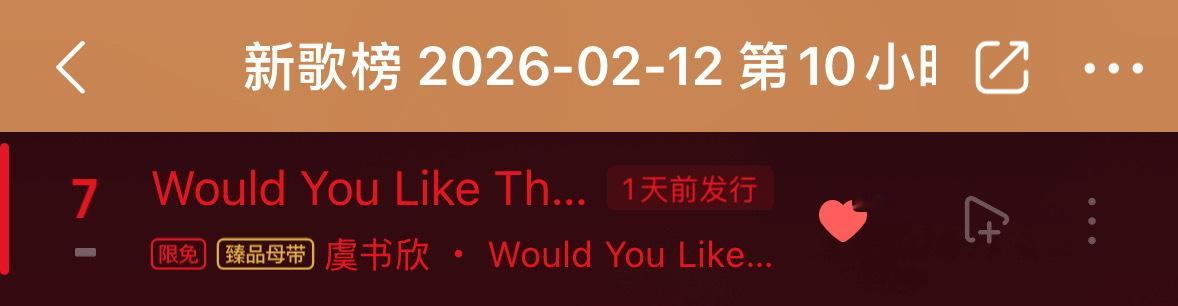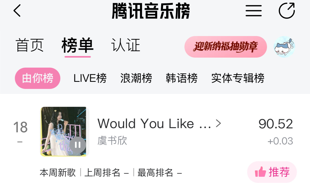 虞书欣新歌Would You Like That上线9个小时QQ音乐新歌榜第7 腾讯音乐由你榜日榜第1 周榜第18