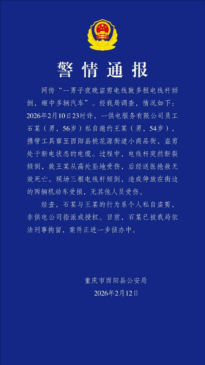 网传“一男子夜晚盗剪电线致多根电线杆倾倒,砸中多辆汽车”。经我局调查,情况如下:2026年2月10日23时许,一供电服务有限公司员工石某(男,56岁)私自邀约王某(男,54岁),携带工具窜至酉阳县桃花源街道小商品街,盗剪处于断电状态的电缆。过程中,电线杆突然断裂倾倒,致王某从高处坠地受伤,后经送医抢救无效死亡。现场三根电线杆倾倒,造成停放在街边的两辆机动车受损,无其他人员受伤。