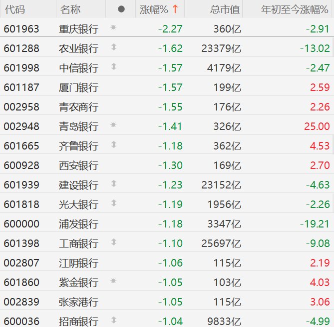 格隆汇2月12日|A股市场银行股集体下跌,其中,重庆银行跌超2%,农业银行、中信银行、厦门银行、青农商行、青岛银行、齐鲁银行、西安银行、建设银行、光大银行、浦发银行、工商银行、江阴银行、紫金银行、张家港行、招商银行跌超1%。