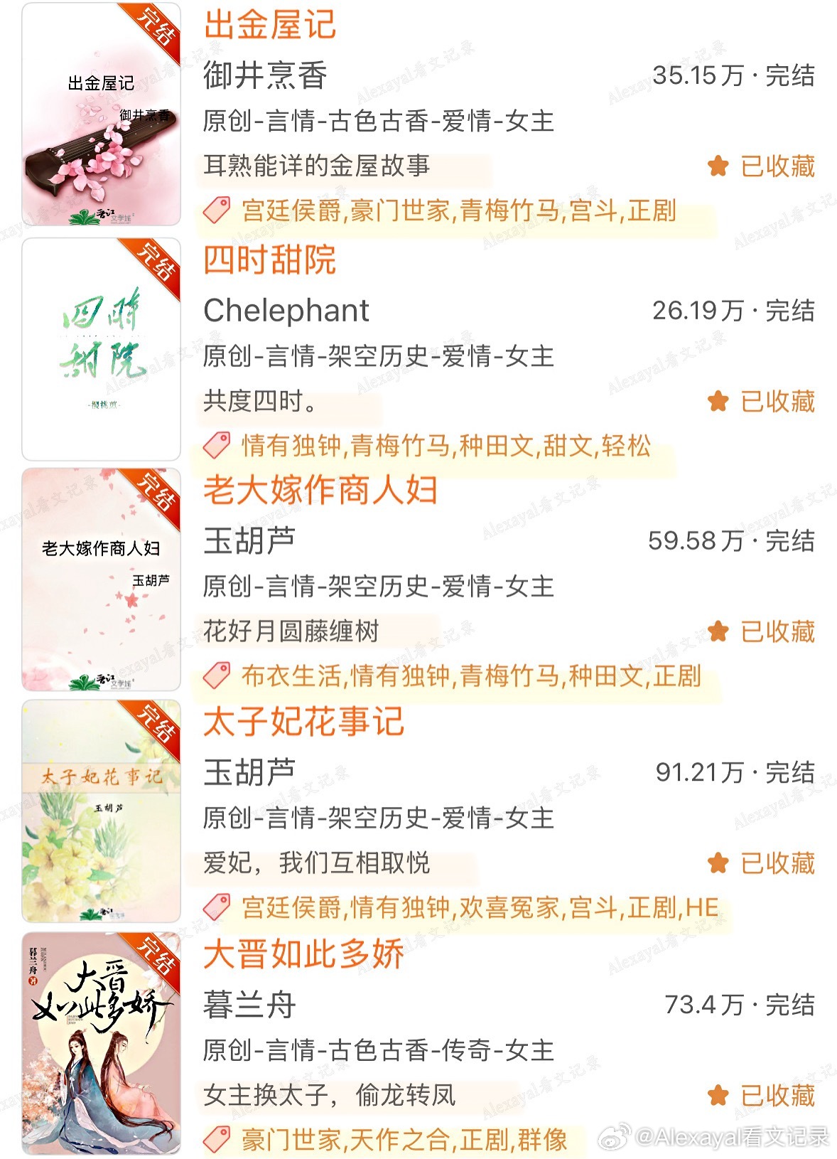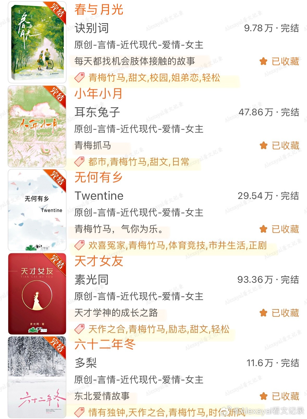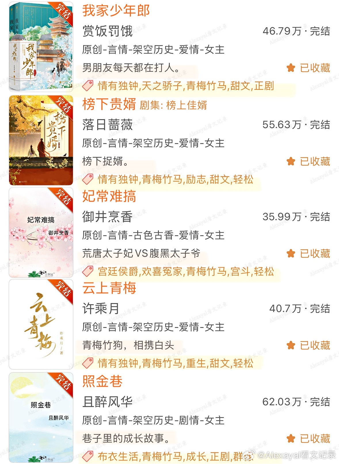 第1️⃣期哪本是你的top?欢迎补充~♦️ 古言◽️ 宫廷侯爵/豪门世家:1.《太子妃花事记》玉胡芦|架空明2.《皇后生存日记》刀豆|南北朝3.《大晋如此多娇》暮兰舟|架空晋4.《我家少年郎》赏饭罚饿5.《出金屋记》《妃常难搞》御井烹香6.《孤城闭》米兰Lady|宋朝7.《云上青梅》许乘月8.《误酒》高跷说唱家◽️种田文:1.《四时甜院》Chelephant2.《老大嫁作商人妇》玉胡芦3.《吉祥如意》◽️成长向:1.《照金巷》且醉风华2.《驭君》坠欢可拾3.《榜下贵婿》落日蔷薇4.《是我哥》♦️ 现言◽️ 竹马打败天降:1.《小世界》陈之遥2.《在春天》《许愿雨》法拉栗/祝古栗3.《单选题》歪柒柒4.《夏天无从抵赖》关抒耳5.《欲言又止最动听》余姗姗6.《无人像她》星河蜉蝣7.《女王的抉择》顾几8.《在傍晚回家》Judy侠◽️ 破镜重圆:1.《多娜》李尾2.《再冬》金丙◽️ 久别重逢:1.《欢迎回家》陈之遥2.《不能出卖小猫咪》映漾3.《无何有乡》Twentine4.《小年小月》耳东兔子◽️ 日久生情/朋友变恋人:1.《最后一束米迦勒雏菊》春十三少2.《只此青郁》青耳3.《欲晓》品丰4.《天才女友》素光同5.《我拿你当朋友你却》画盏眠6.《我们》辛夷坞7.《青梅竹马的正确打开方式》福宝8.《君子坦荡荡 小人长缨缨》坡西米9.《时光因你而动听》金陵雪10.《杳杳》林不答◽️ 短篇:1.《那天冬天什刹海没有结冰》《北海有条龙》坡西米2.《六十二年冬》多梨3.《春与月光》诀别词4.《蜉蝣屿》糖番茄5.《一朵花跟森林》或扉◽️ 校园:1.《你好,旧时光》八月长安2.《好好学习,天天恋爱》青青绿萝裙|重生3.《回到那年称王称霸》坡西米|双穿越4.《堂前巷里》梁仝/碎鸦♦️ 西幻:1.《被宿敌复.活后》兮树2.《爱的失败作》镜台♦️ 民国:1.《琉璃钟,琥珀浓》容九2.《重庆公寓》内容🈲转载❗️