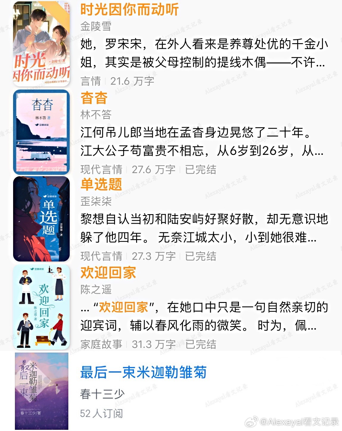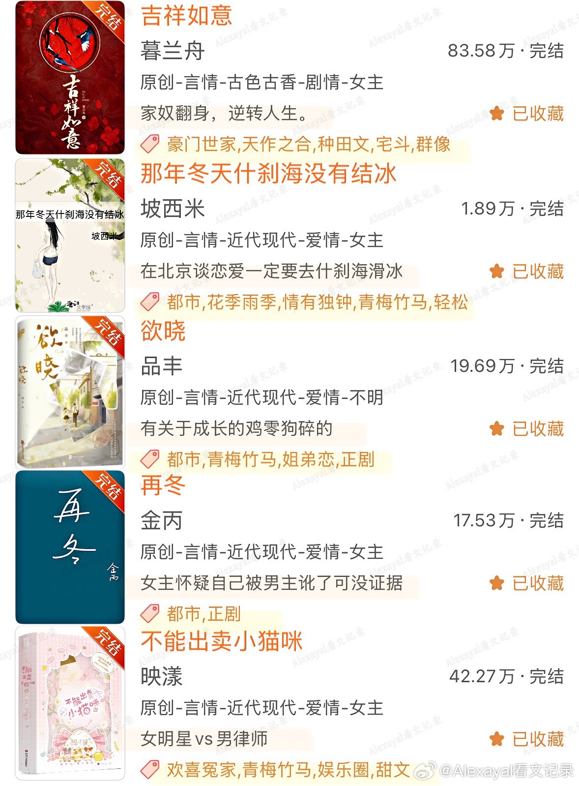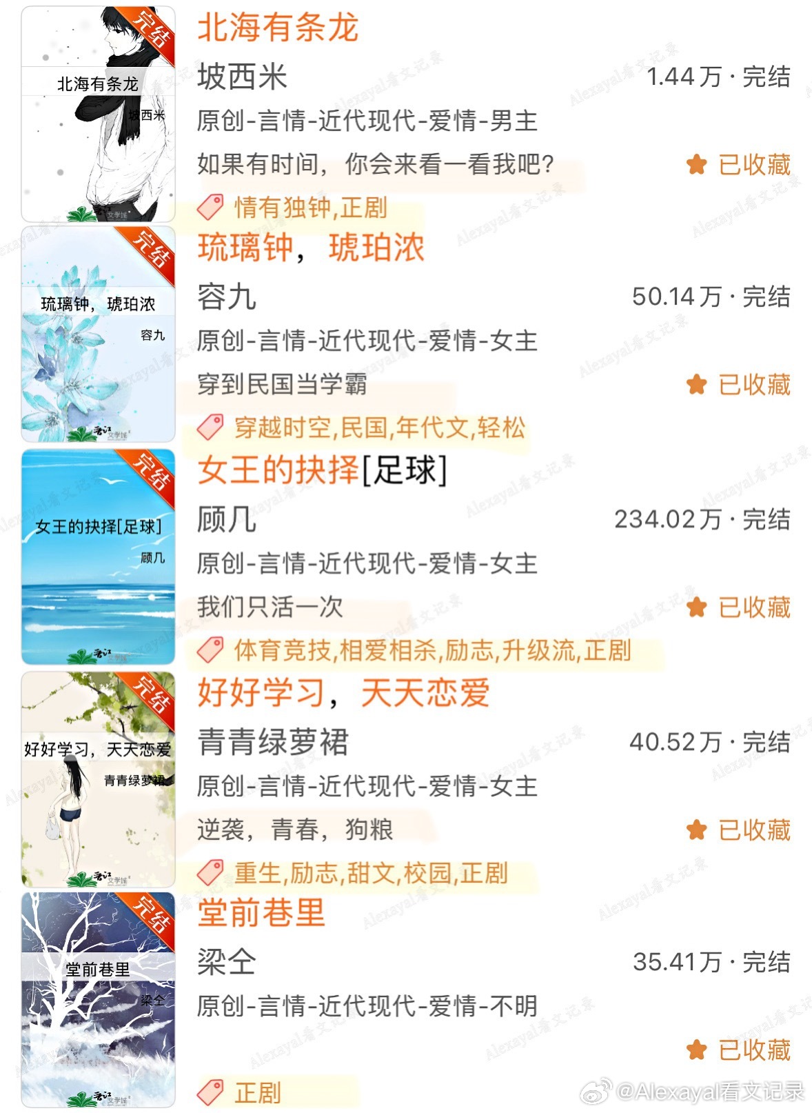 第1️⃣期哪本是你的top?欢迎补充~♦️ 古言◽️ 宫廷侯爵/豪门世家:1.《太子妃花事记》玉胡芦|架空明2.《皇后生存日记》刀豆|南北朝3.《大晋如此多娇》暮兰舟|架空晋4.《我家少年郎》赏饭罚饿5.《出金屋记》《妃常难搞》御井烹香6.《孤城闭》米兰Lady|宋朝7.《云上青梅》许乘月8.《误酒》高跷说唱家◽️种田文:1.《四时甜院》Chelephant2.《老大嫁作商人妇》玉胡芦3.《吉祥如意》◽️成长向:1.《照金巷》且醉风华2.《驭君》坠欢可拾3.《榜下贵婿》落日蔷薇4.《是我哥》♦️ 现言◽️ 竹马打败天降:1.《小世界》陈之遥2.《在春天》《许愿雨》法拉栗/祝古栗3.《单选题》歪柒柒4.《夏天无从抵赖》关抒耳5.《欲言又止最动听》余姗姗6.《无人像她》星河蜉蝣7.《女王的抉择》顾几8.《在傍晚回家》Judy侠◽️ 破镜重圆:1.《多娜》李尾2.《再冬》金丙◽️ 久别重逢:1.《欢迎回家》陈之遥2.《不能出卖小猫咪》映漾3.《无何有乡》Twentine4.《小年小月》耳东兔子◽️ 日久生情/朋友变恋人:1.《最后一束米迦勒雏菊》春十三少2.《只此青郁》青耳3.《欲晓》品丰4.《天才女友》素光同5.《我拿你当朋友你却》画盏眠6.《我们》辛夷坞7.《青梅竹马的正确打开方式》福宝8.《君子坦荡荡 小人长缨缨》坡西米9.《时光因你而动听》金陵雪10.《杳杳》林不答◽️ 短篇:1.《那天冬天什刹海没有结冰》《北海有条龙》坡西米2.《六十二年冬》多梨3.《春与月光》诀别词4.《蜉蝣屿》糖番茄5.《一朵花跟森林》或扉◽️ 校园:1.《你好,旧时光》八月长安2.《好好学习,天天恋爱》青青绿萝裙|重生3.《回到那年称王称霸》坡西米|双穿越4.《堂前巷里》梁仝/碎鸦♦️ 西幻:1.《被宿敌复.活后》兮树2.《爱的失败作》镜台♦️ 民国:1.《琉璃钟,琥珀浓》容九2.《重庆公寓》内容🈲转载❗️