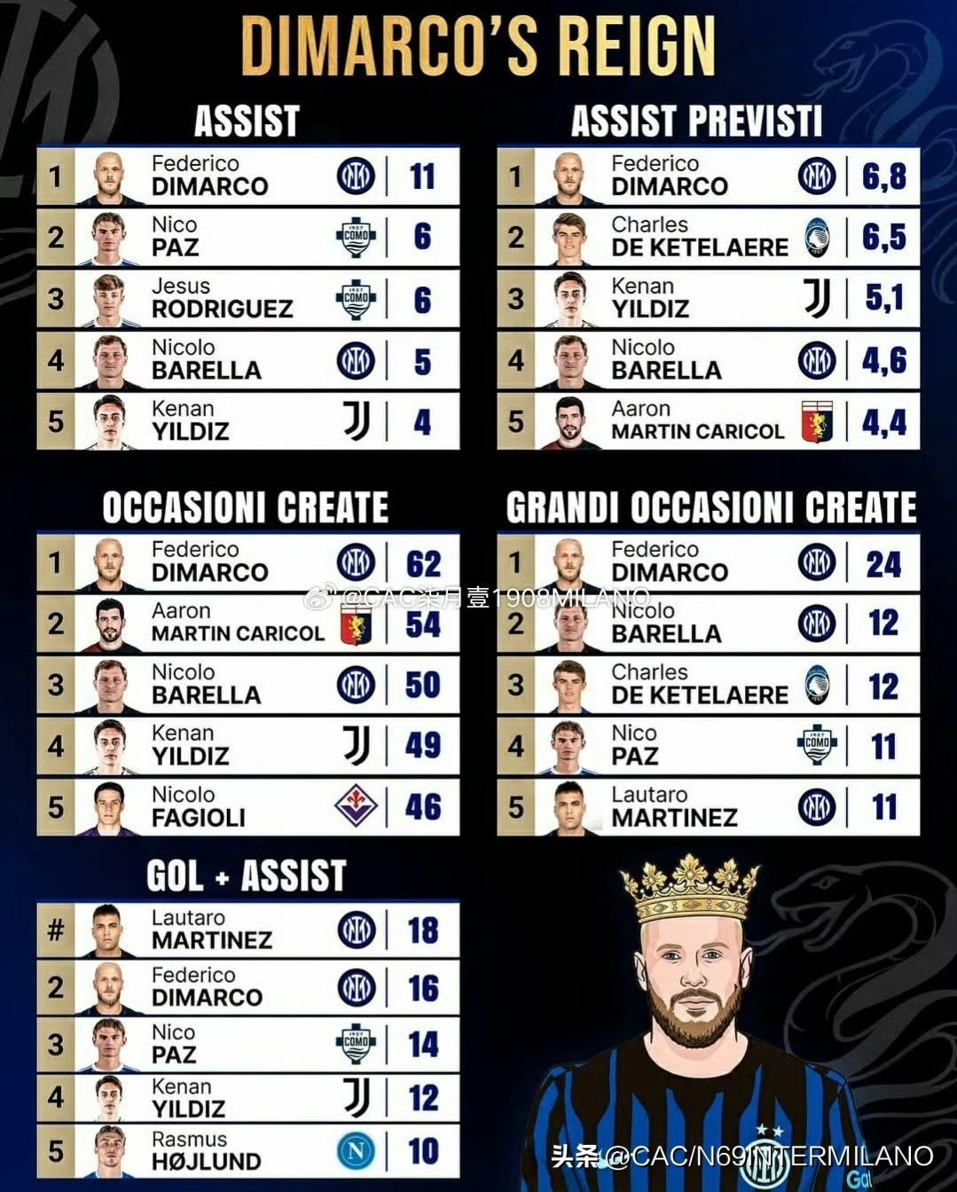 曼努埃尔'阿坎吉一道坚固的防线! 在夏季转会市场接近尾声之际,阿坎吉悄悄抵达米兰城,他立即赢得了齐沃的信任,最初是左中右,后来居中,甚至还可以客串后腰,他以鲜明的个人风格和战术智慧为国际米兰防线带来巨大稳定性。 或许有些人还未意识到, 但劳塔罗在国际米兰的进球数仍在不断攀升, 从一个来自阿根廷、起初因出场次数不多而与光头 发生过争议的陌生少年,到如今登上国际米兰历史 射手榜前三位,这是属于他的荣耀也是球迷的惊喜, 历史射手榜前五位终于有一位是我们见证登上去的。 迪马尔科的数据完全霸榜, 在24轮联赛中,历史上,注意是历史上, 从未有同位置球员像他一样完成这一壮举, 迪马尔科以十一次助攻领跑联赛助攻榜单, 而且他还打进五球,24轮比赛个人造16球, 这是一项恐怖的纪录,完全是一个前锋的数据, 我甚至不看专业数据统计,我都知道截止到今天 太子仍然是全欧创造机会最多的球员,没有之一。 联赛最佳球员,欧冠最佳球员,月最佳球员, 迪马尔科打出了最近几个赛季最高光的时刻, 虽然前几个赛季也很出色,但最近是另外维度!