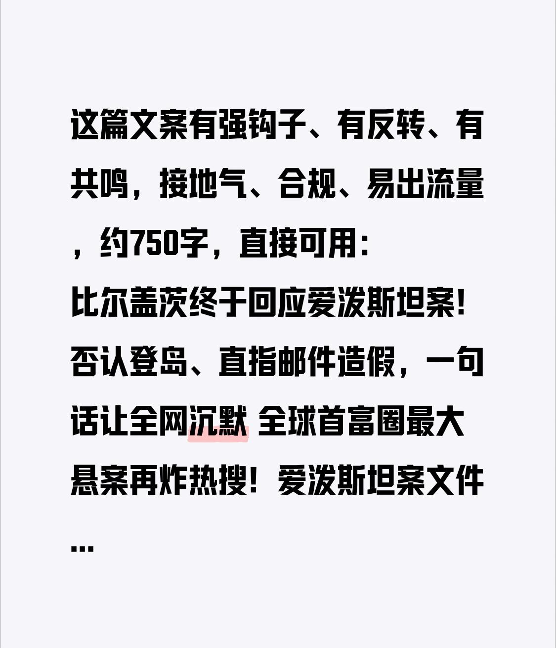 这篇文案有强钩子、有反转、有共鸣,接地气、合规、易出流量,约750字,直接可用: 比尔盖茨终于回应爱泼斯坦案!否认登岛、直指邮件造假,一句话让全网沉默 全球首富圈最大悬案再炸热搜!爱泼斯坦案文件持续曝光,比尔盖茨被卷进风暴中心。面对婚外情、染病、登岛等重磅指控,他终于正面回应,态度干脆、道歉诚恳,却也让舆论吵翻了天。 很多人只知道爱泼斯坦是重刑犯,却不清楚他长期混迹顶级圈层,以慈善筹款为幌子,拉拢名流、积累人脉。此次文件曝光,直指盖茨与涉案女性有关、曾踏足私人岛屿,甚至有未发送邮件暗示不当行为,瞬间击穿公众对科技慈善家的滤镜。 就在舆论一边倒质疑时,比尔盖茨给出清晰回应:全盘否认核心指控。他明确表示,从未去过“萝莉岛”,从未接触受害者,相关邮件是爱泼斯坦未发出的虚假内容,纯属捏造。他坦言,当年因慈善筹款与对方接触,如今回看,每一分钟都后悔,公开为这段交往道歉。 转折来了:前妻梅琳达同步发声,直指此事带来婚姻痛苦,侧面坐实这段关系的负面影响。一边是坚决澄清、认错不认罪;一边是家人受伤、公众不信任;一边是已离世的爱泼斯坦留下的模糊文件,真相难100%还原。 盖茨团队补充,双方合作早已破裂,相关内容更像是恶意抹黑与施压。但网友并不买账:顶级精英为何与重刑者往来?明知对方有前科,为何还要合作?一句后悔,真能抹平所有疑问吗? 这件事之所以刷屏,不只是富豪八卦,更戳中普通人的痛点:圈层的双重标准、人设的脆弱、底线的重要。再高的财富、再大的名气,都不该成为越界的保护伞;再完美的公益形象,也遮不住私德与选择的瑕疵。 我们不造谣、不信谣、不网暴,只相信事实与证据。盖茨的回应理清了关键信息,道歉也有态度,但真相还需要更多文件与调查来验证。 真正让人共鸣的是:无论贫穷富有,做人最稳的底牌,永远是清醒、底线与敬畏。别等风波上身才后悔,别等人设崩塌才补救。 你觉得比尔盖茨的回应可信吗?这段顶级圈层的纠葛,你怎么看?评论区聊聊!