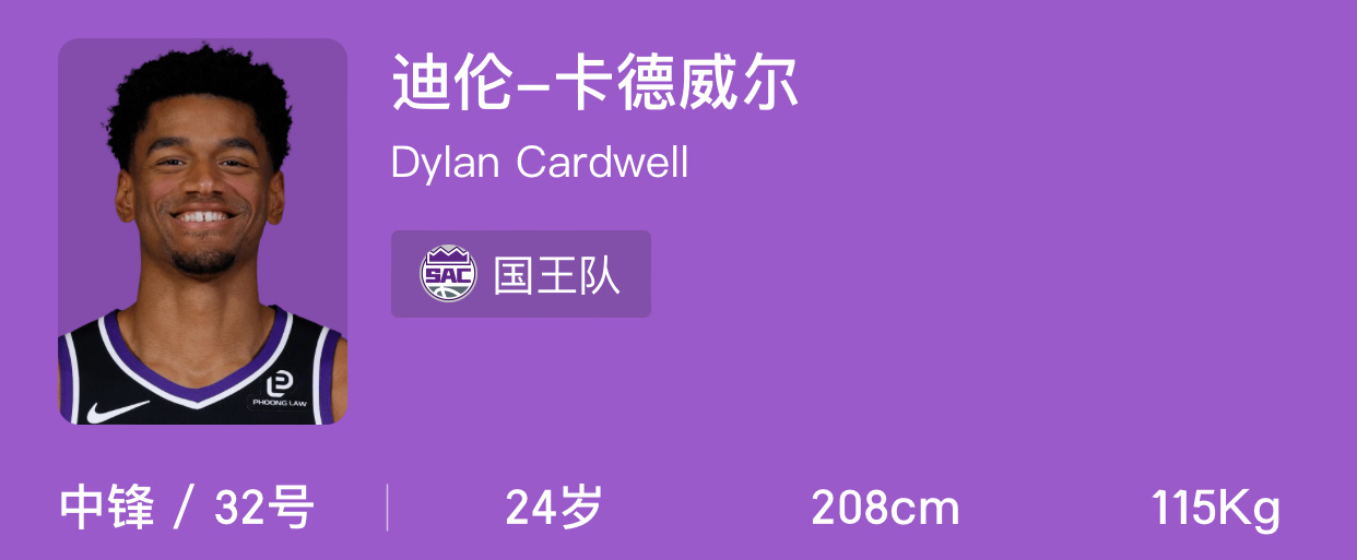 迪伦卡德威尔本届落选新秀 国王替补中锋,靠低调努力乐观幸运,收获国王四年正式合同,目前在所有新秀中,防守DPM值和防守影响力评分均位列第一。他在场上时,他几乎能锁死对手