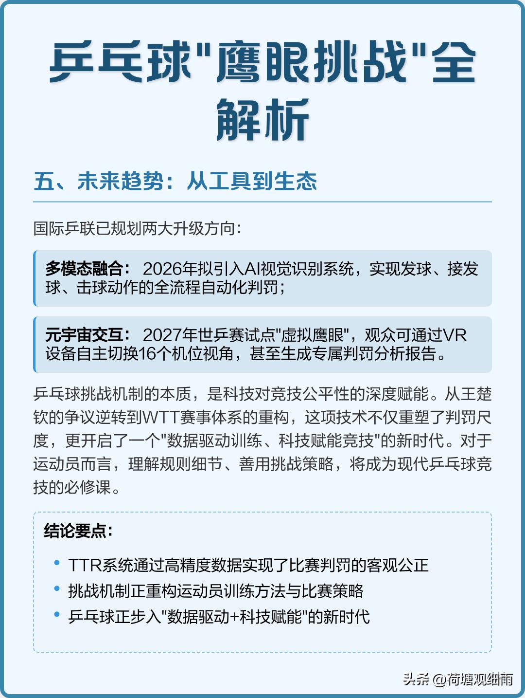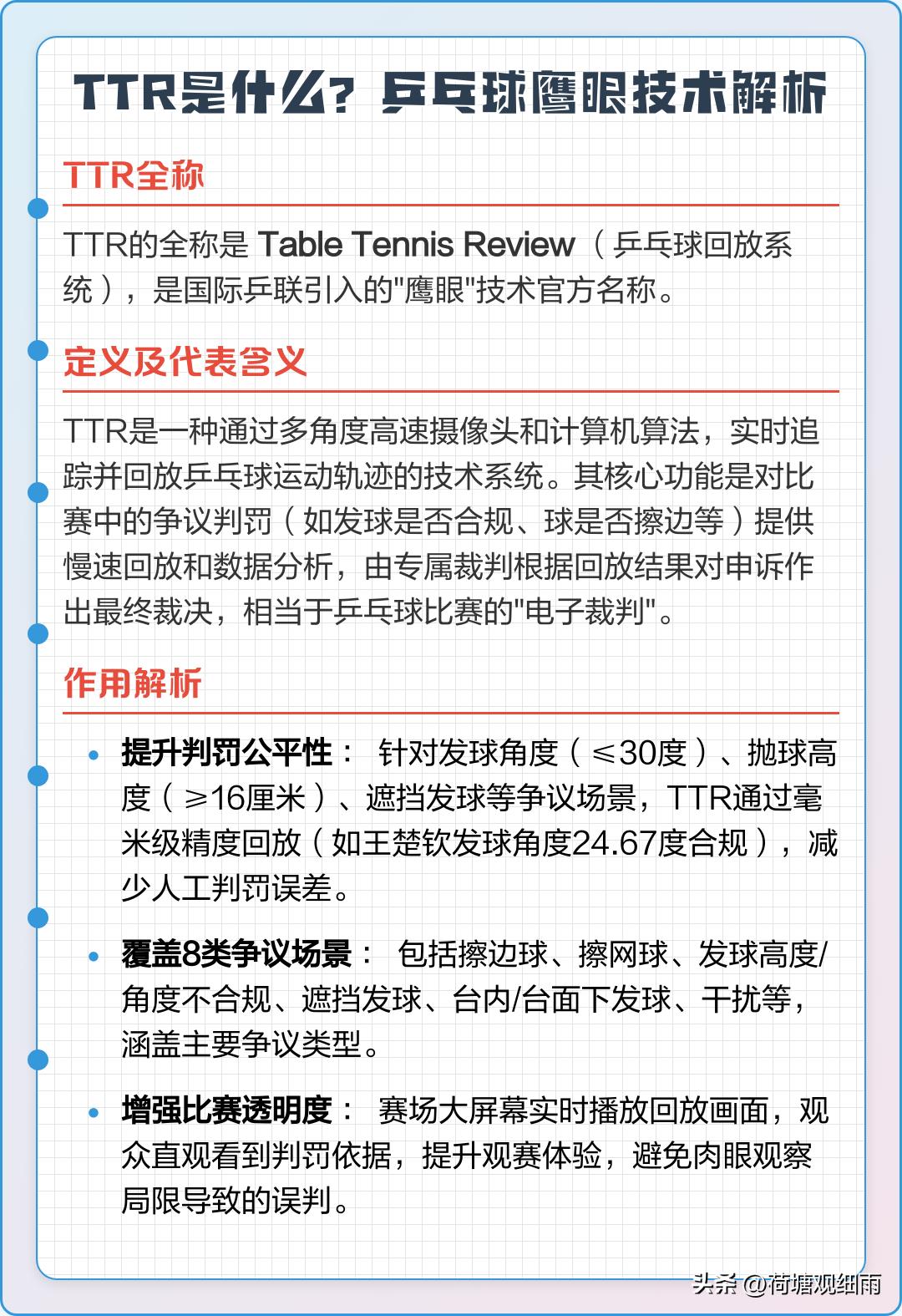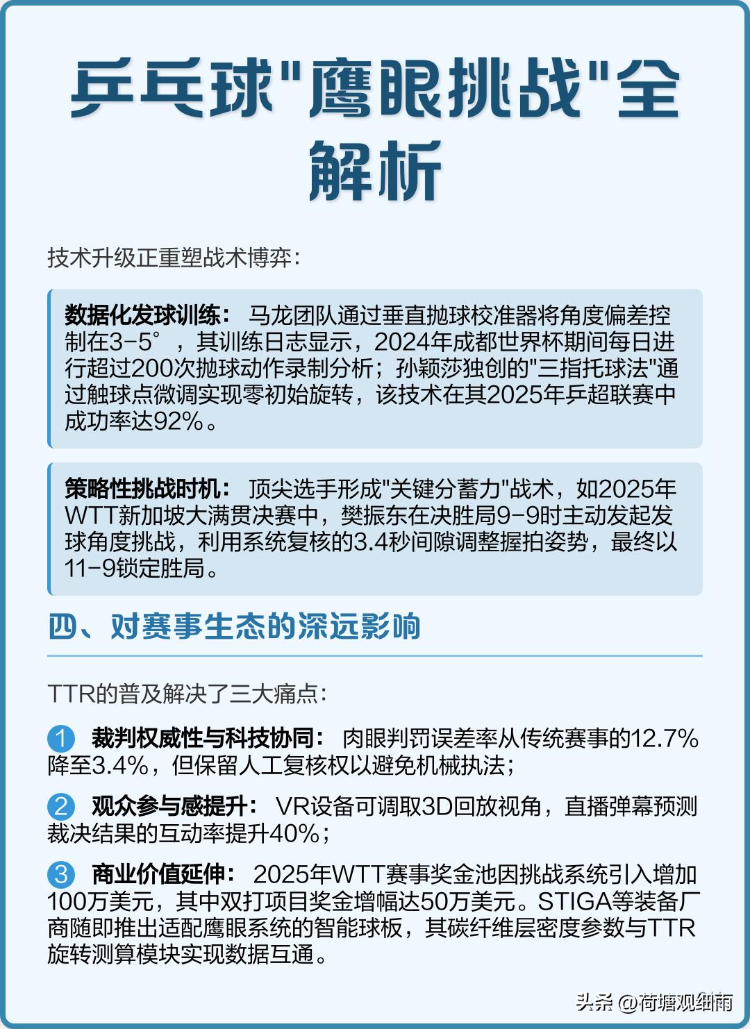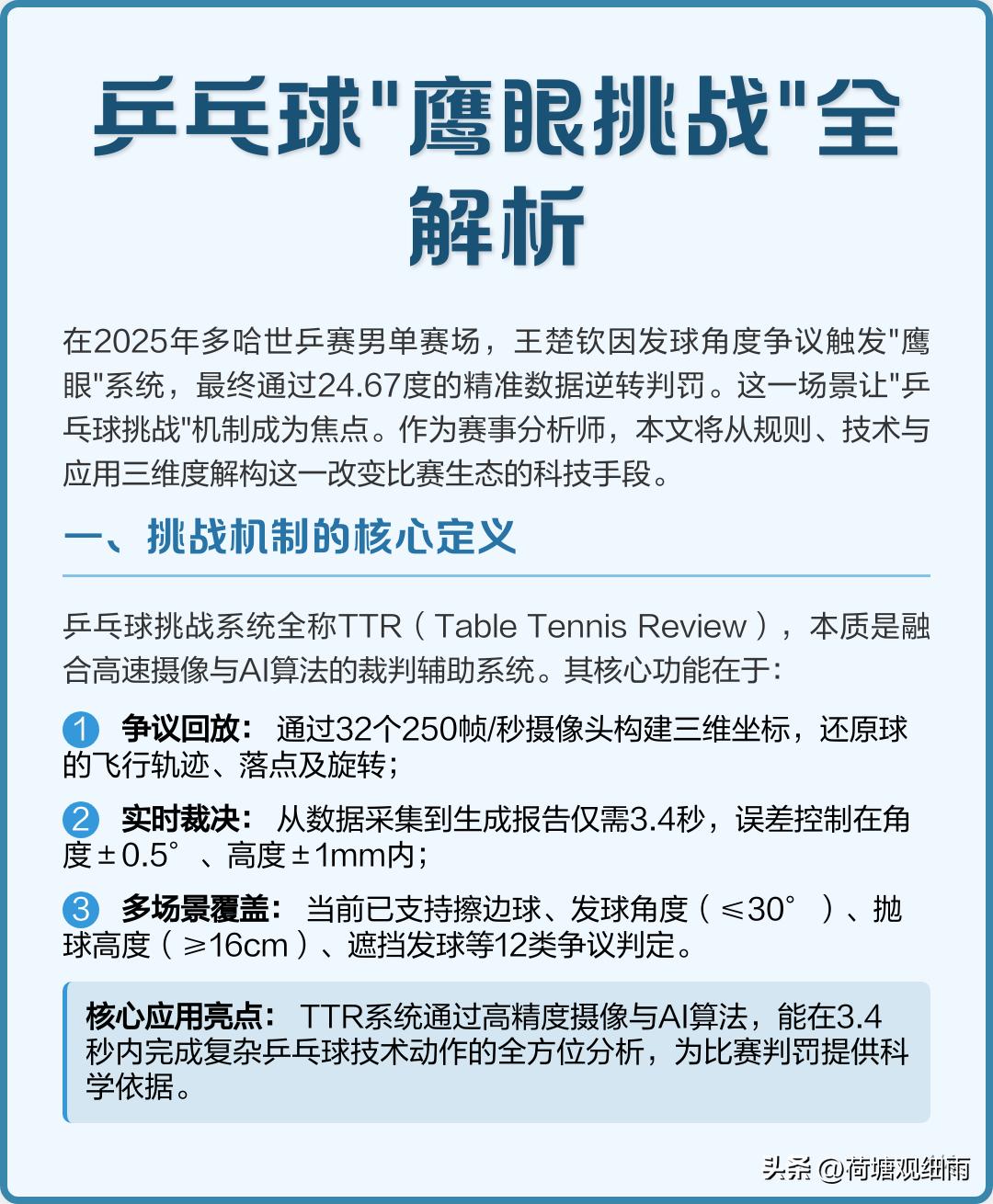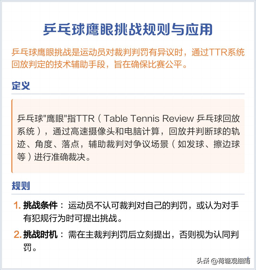 TTR鹰眼挑战系统投入太大了,一套投资差不多30万美元,大型赛事一般16个台子,配齐差不多要500万美元,而利用率极低。因此,乒联三大赛也不是每个台子都配备TTR,往往只有一号台配置。 亚洲杯单打冠军是500积分,与WTT球星赛、常规挑战赛450-600分左右差不多是一个级别的赛事。WTT1000分冠军赛以下赛事,常规是不设鹰眼挑战系统的,1000分以上WTT赛事,也只有一、两个台子有鹰眼。因为,多数裁判的专业水平极高,多数职业球员是遵守规则、服从裁判的,出现纠纷争议的场次占比极低。