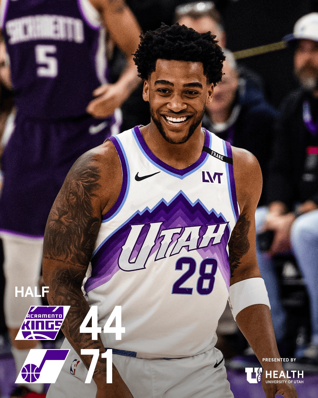 第二节比赛结束,爵士71-44领先国王。