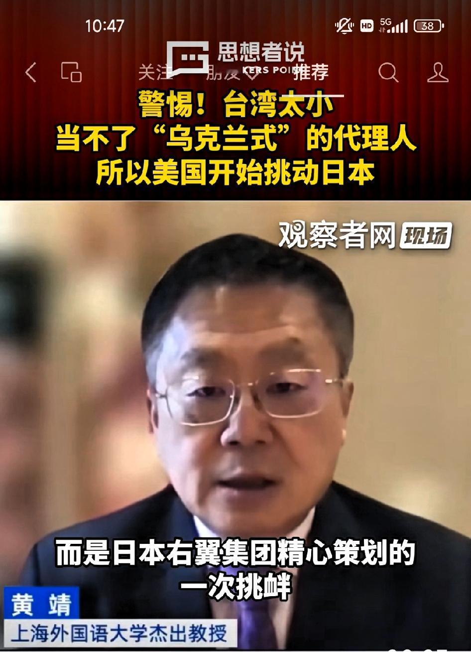 台湾太小,当不了“乌克兰式”代理人,所以美国开始挑动日本! 我们仔细回顾整个历史,有三个主要原因: 第一 日本曾经对中国犯下了滔天的战争罪行,至今都没有被清算。如果真的像德国那样被完全清算,日本今天就不会那么猖狂。一个犯了重大罪行的人,如果不对他的罪行进行完全清算,那么他很可能会再来。 第二 如果在中国周边地区找一个有资格,有能力,有意愿当继续控制中国的代理人,日本是唯一的选择。你可以想象,如果有一天一个大国想和你对抗的话,他要在中国的家门口找一个“乌克兰式”的代理人,那就是日本,台湾根本没有资格。我说的是日本右翼,也就是高市早苗,这也就是中国一定要把它压下去的根本原因。我们不允许自己家门口有一个定时炸弹随时引爆。 第三 “台独”的根子实际是在日本,所有的“台独力量”都是在所谓日据时期培养起来的。从李登辉到陈水扁到后来的蔡英文到现在的赖清德。凡是搞台独的,他最看重的就是日本的支持。现在特朗普对台湾有点要放手的样子,所以日本就是他实施“代理人战争”的唯一可能。 以上内容来自于对上海外国语大学教授黄靖的采访!