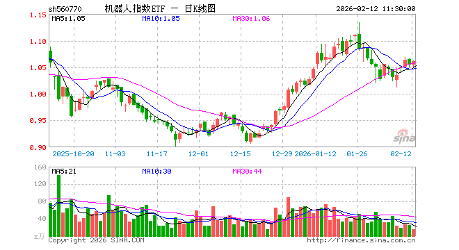 2月12日,截止午间收盘,机器人指数ETF(560770)涨0.66%,报1.061元,成交额1568.53万元。机器人指数ETF(560770)重仓股方面,科大讯飞截止午盘涨1.29%,汇川技术涨0.21%,拓普集团涨1.48%,大华股份涨0.53%,大族激光跌1.04%,双环传动涨0.90%,石头科技跌2.63%,中控技术跌0.85%,绿的谐波涨1.75%,机器人涨0.23%。
