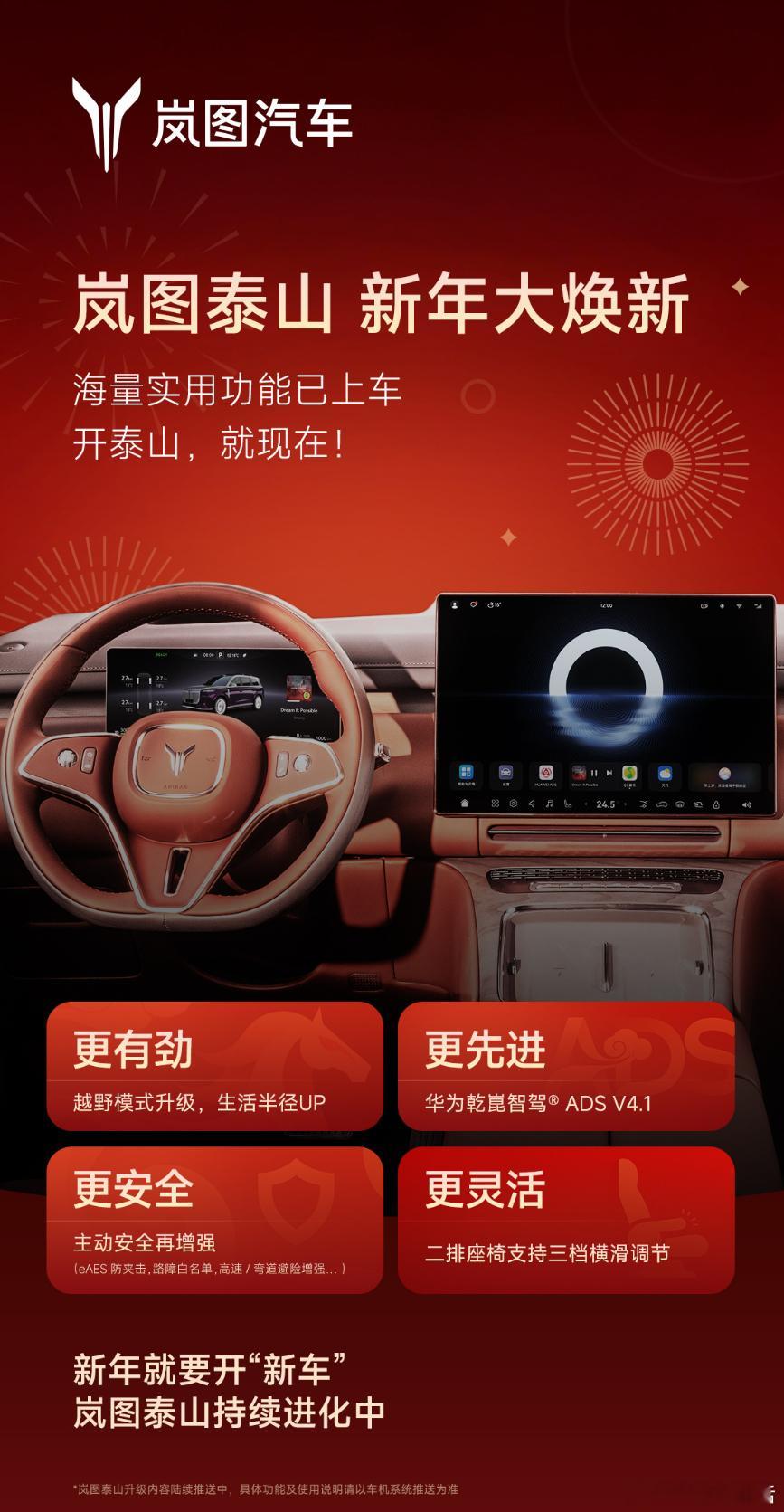 岚图泰山首次重大OTA升级真是令人期待!这次升级真诚满满,以华为的智能驾驶系统为核心,安全性能更上一层楼,像eAES和急弯护航功能,都是为我们出行提供了更强的安全保障。越野能力也有了显著提升,三腔空气悬架和后轮转向的搭配,让泰山无论在城市还是复杂路况下都能游刃有余!期待体验这次升级带来的全新乐趣!
