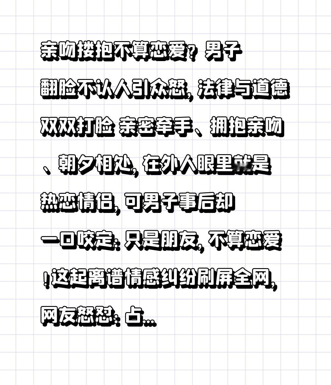 亲吻搂抱不算恋爱?男子翻脸不认人引众怒,法律与道德双双打脸 亲密牵手、拥抱亲吻、朝夕相处,在外人眼里就是热恋情侣,可男子事后却一口咬定:只是朋友,不算恋爱!这起离谱情感纠纷刷屏全网,网友怒怼:占便宜就认,谈关系就躲,太没担当! 女子哭诉,两人长期保持亲密接触,一起约会、独处、有专属的肢体亲近,她一直以为是正常恋爱。可当她想要明确关系、索要尊重时,男方突然变脸,全盘否认恋爱事实,把所有亲密举动轻描淡写为“朋友间的正常往来”。 这番言论瞬间引爆舆论。大家愤怒不已:亲吻、搂抱是情侣专属的亲密边界,不是普通朋友该有的距离。享受了恋人的待遇,却不愿负恋人的责任,只想要暧昧的便利,不想有承诺的约束,这不是洒脱,是自私,是赤裸裸的情感PUA! 就在全网声讨渣男时,关键转折来了:法律与公序良俗给出明确答案!我国《民法典》明确保护人格尊严与身体自主权,亲密行为默认建立在自愿、明确的情感关系之上。若一方以“不算恋爱”为由,刻意模糊边界、误导对方付出情感与身体,已违背诚信与公序良俗;若存在违背意愿的强制接触,还可能涉嫌性骚扰、强制猥亵,要承担法律责任。 法院同类判例早已说明:亲密行为是恋爱关系的核心表征,不能事后翻脸不认账。男子的辩解,在事实与常理面前站不住脚,更逃不过道德的审视。 这件事之所以戳中无数人,是因为它揭开了当代情感关系里最丑陋的一面:边界感缺失、责任感缺位。有人把暧昧当特权,把逃避当本事,用“不算恋爱”当挡箭牌,肆意消耗别人的真心。 真正的感情,从来不是偷偷摸摸的占便宜,而是光明正大的承认与负责。不喜欢就别撩,不负责就别碰。尊重别人的情感,守住自己的底线,才是成年人最基本的教养。 别再用“朋友”当借口伤害真心,别让模糊的边界,消耗掉最珍贵的信任。愿每一份真诚都不被辜负,每一次付出都能被认真对待。 支持严惩情感渣男、守住亲密边界的,点赞转发,让更多人看清套路,保护好自己!