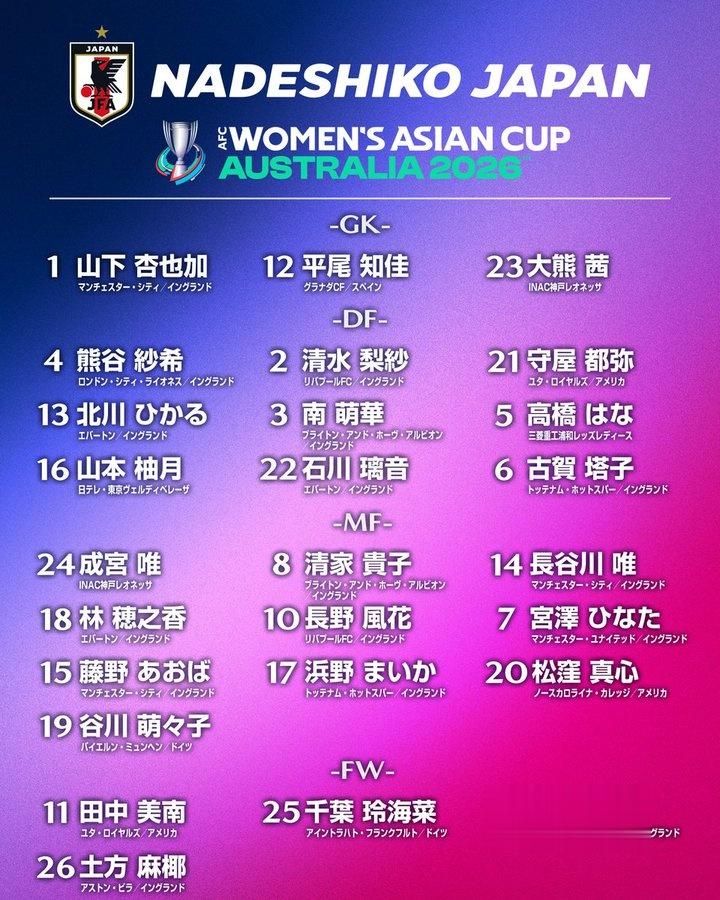 直播吧2月12日讯今日,日本女足公布了女足亚洲杯名单,26人中仅4人在国内联赛效力,其余全部留洋海外。长谷川唯、清水梨纱、熊谷纱希、谷川萌萌子等知名球员悉数入选。具体如下: