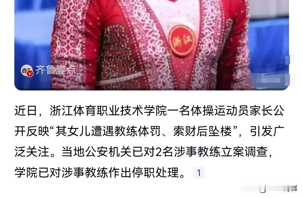 这真是太恶劣了。 有教练竟然敢体罚运动员、更恶劣的是还向运动员索要钱财。 这可是严重的违法违纪啊。 这是近日网上传播的一个事情,体操运动员坠楼,教练被立案调查。 得好好查查这个事件,该追责的追责。 这样的教练简直就是败类,不会教就别占这个位置,一些心术不正的人当教练,那简直是运动员的灾难。体操运动员坠楼 教练被立案调查