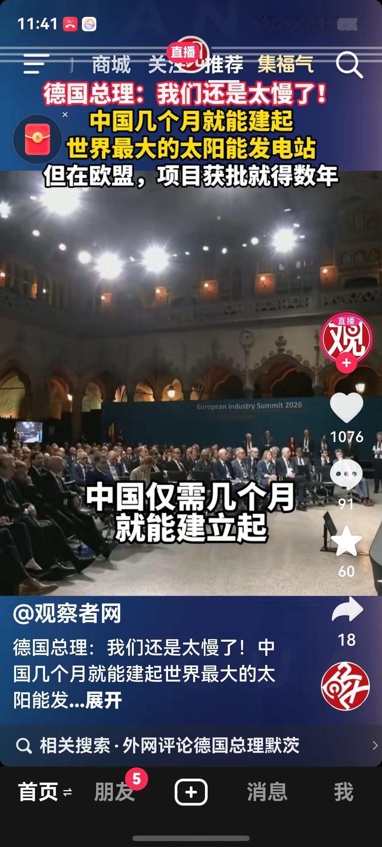 德国总理默茨还是有点急了,他大声说我们还是太慢了。 中国几个月就能建成世界上最大的太阳能发电站,而欧盟光项目审批就要数年。 看这艳羡的目光和急切表达方式就知道,他想来中国拜年了。 欧盟采取的步调一致,就是慢性病的原因。本来他们是欧洲经济共同体,他们结果把自己包装成一个外交政治一体化的欧盟,本意当初是为了抗衡美国的影响力,没曾想又亦步亦趋把自己当成美国跟班,现在用中国成语“作茧自缚”“搬起石头砸了自己的脚”来形容很恰当。 我们希望他们能够独立自主,吃惯了北约防务的红利,他们依从性改不了。别指望他们和中国攀亲戚。他们骨子里就是“一丘之貉”。