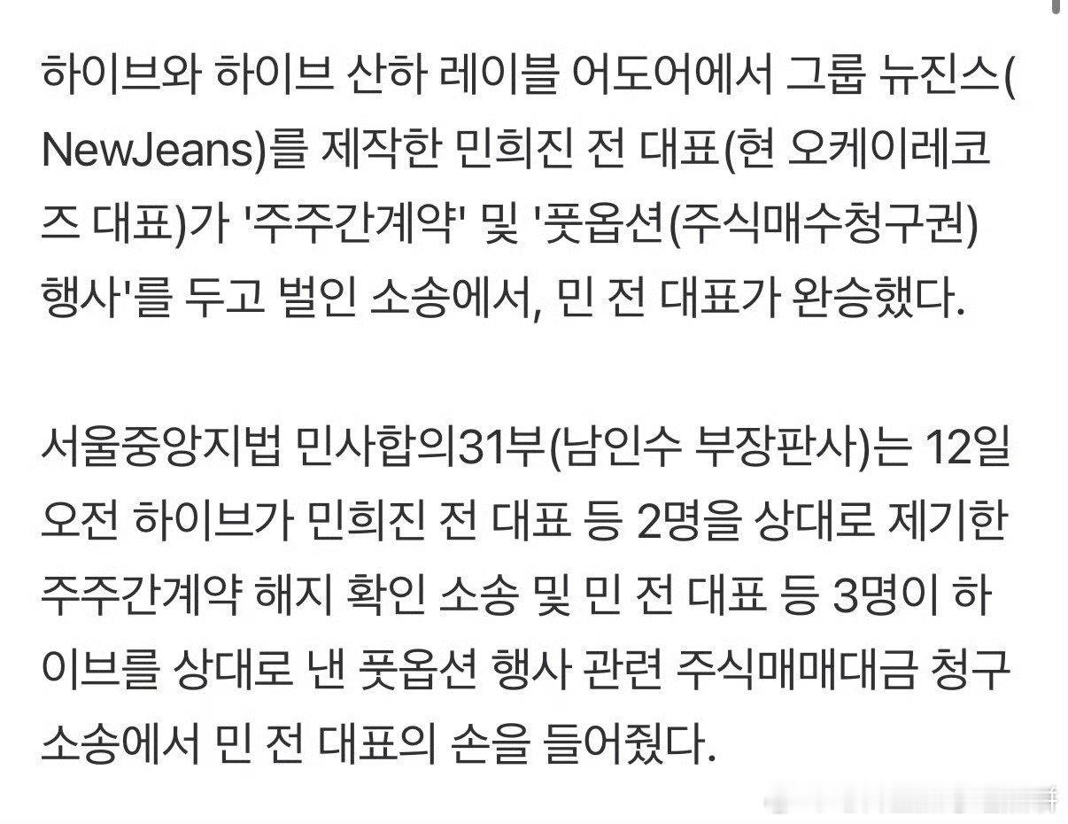 闵熙珍在和HYBE的诉讼中胜诉,法院大体采用了闵这一方的主张,驳回了HYBE的大