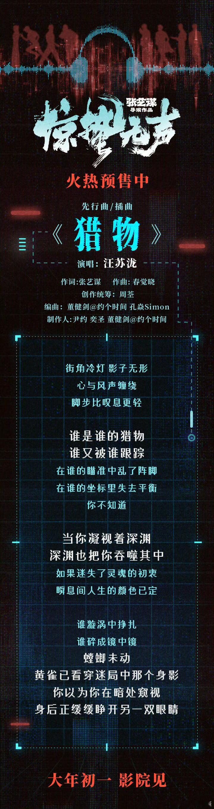张艺谋时隔多年再为电影作词 国师不止会导戏更会写词!张艺谋为《惊蛰无声》亲创三首OST,《猎物》意境深邃,字字藏暗战,期待拉满