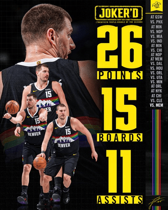 赛后,掘金官方发布约基奇数据海报,并配文道:“第15号球员的第20次三双。”